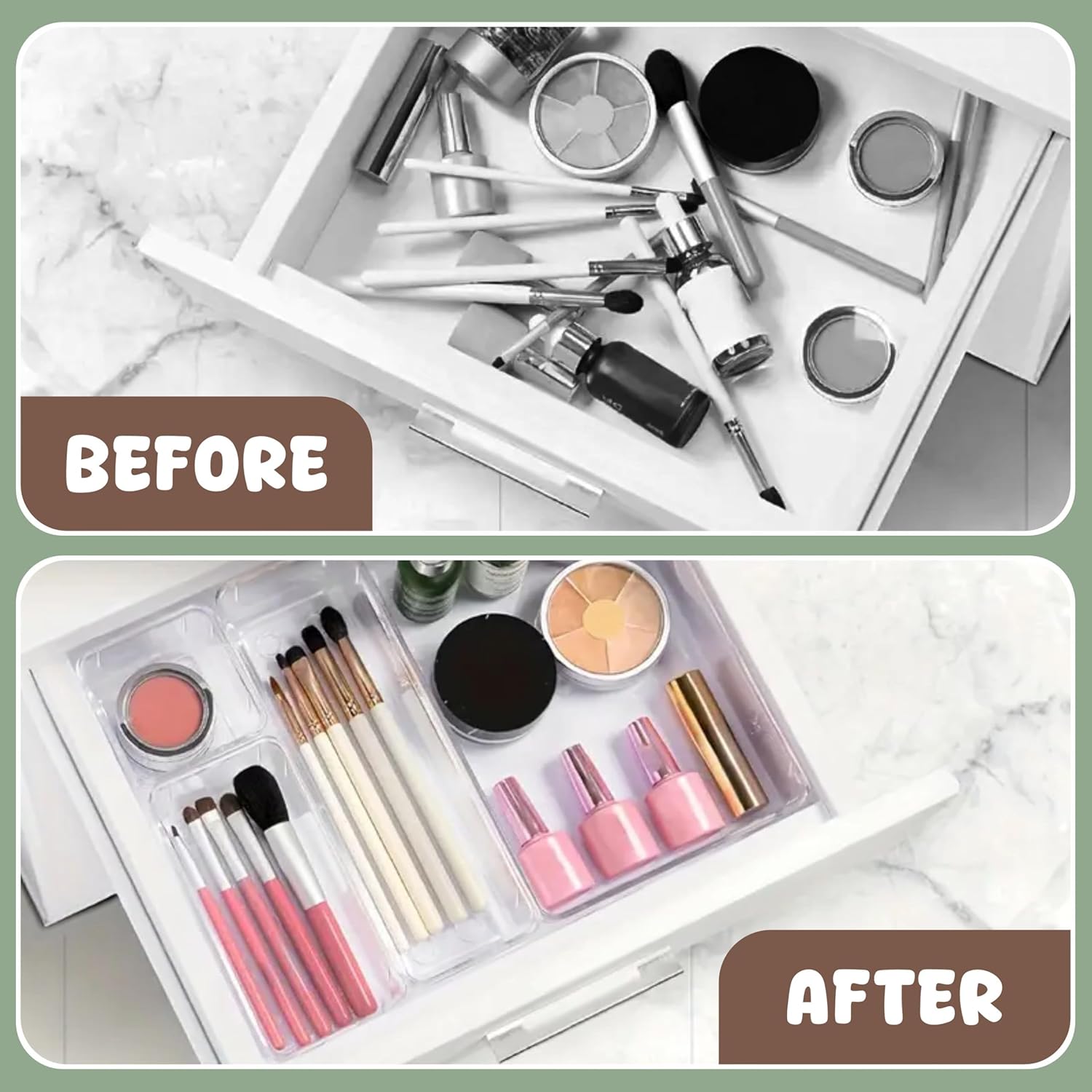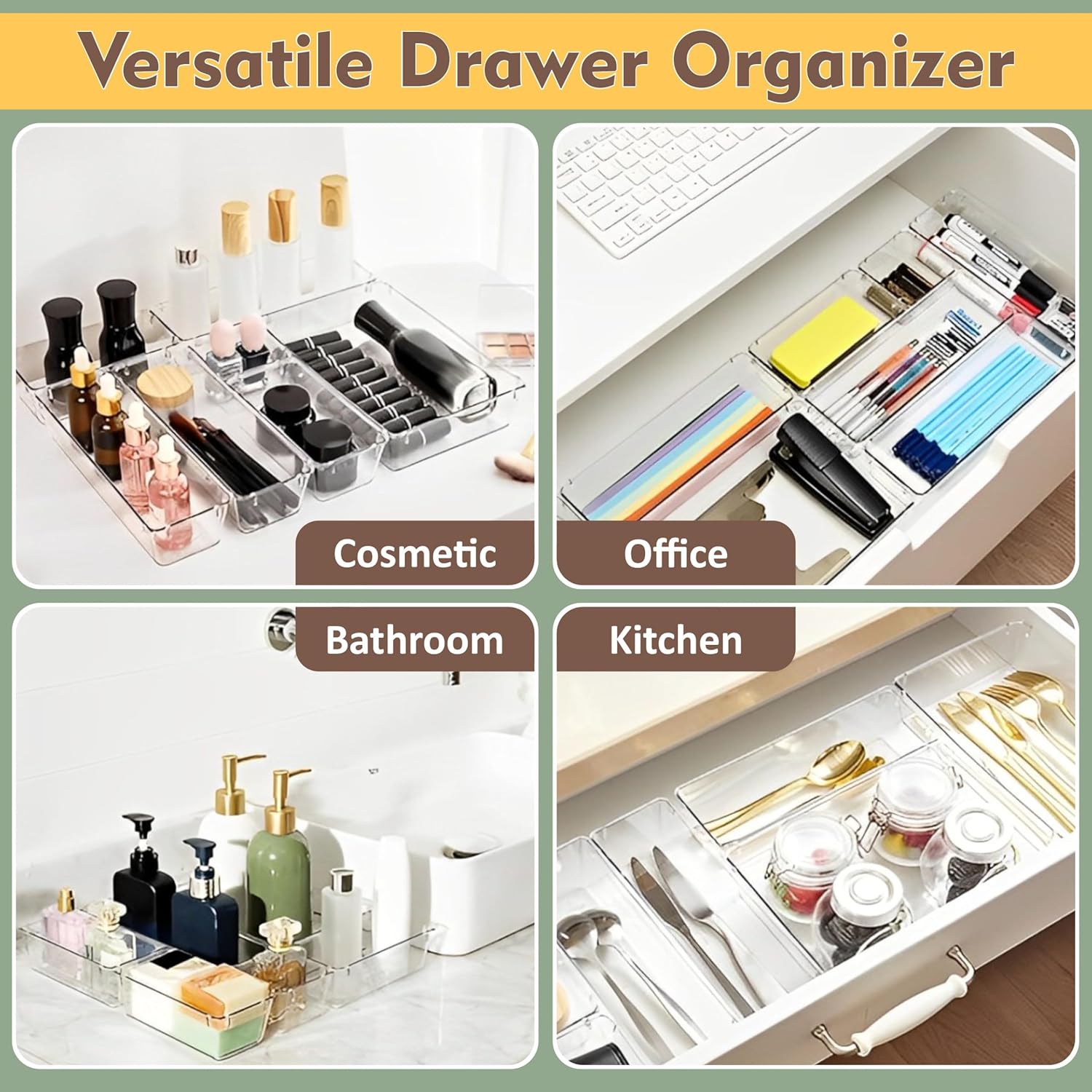 Very useful and sturdy organizer set with multiple sizes to fit any drawer. The transparent design looks clean and makes items easy to find. Great for makeup, kitchen, or bathroom storage.
