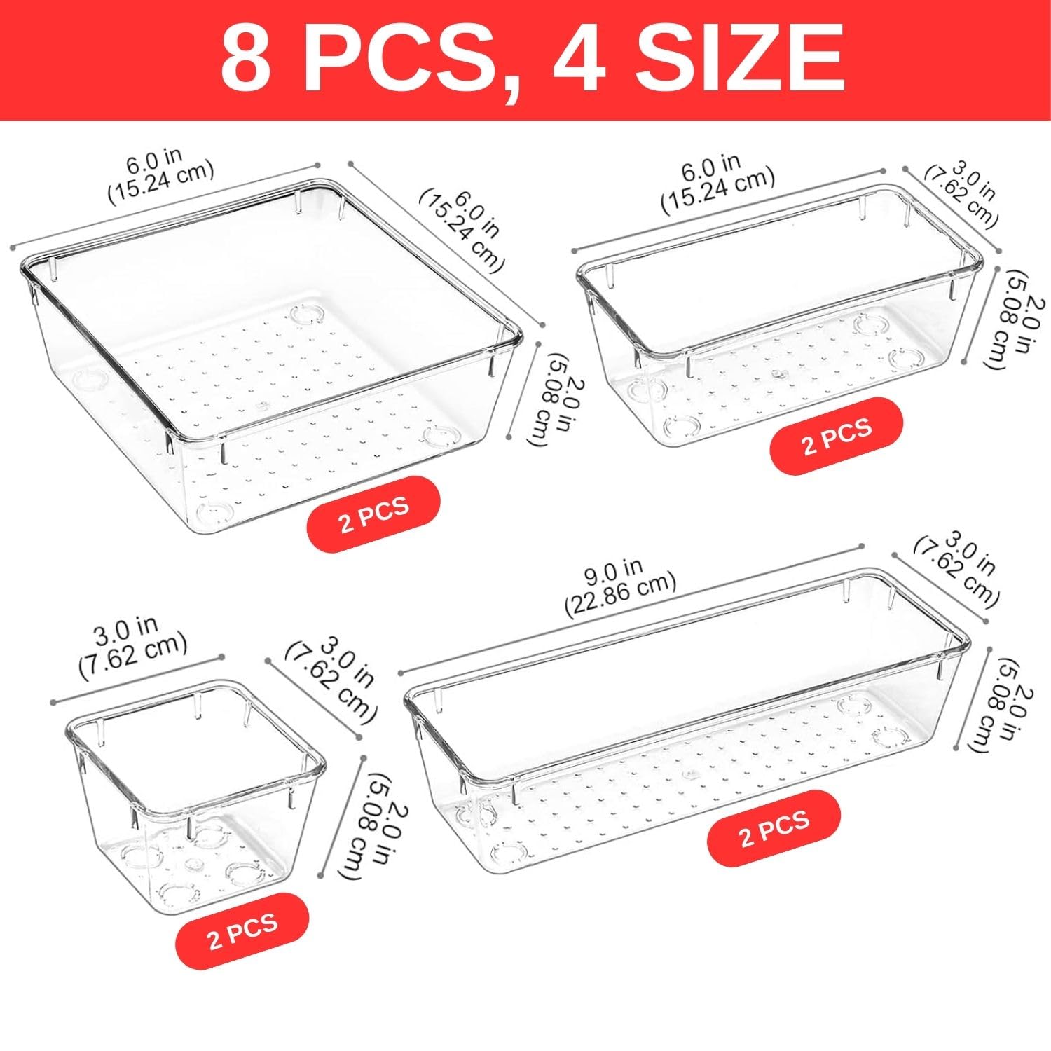 Combination of 4 Different Sizes: One set includes 8pcs storage Organizer in 4 different sizes, which help you customize combinations to store items and organize drawer in shelf/ closet/ cabinet/ dresser. Size in Inches- (3 x 3 x 2 inches – 2 Pcs), (6 x 3 x 2 inches – 2 Pcs), (9 x 3 x 2 inches – 2 Pcs) and (6 x 6 x 2 inches – 2 Pcs).