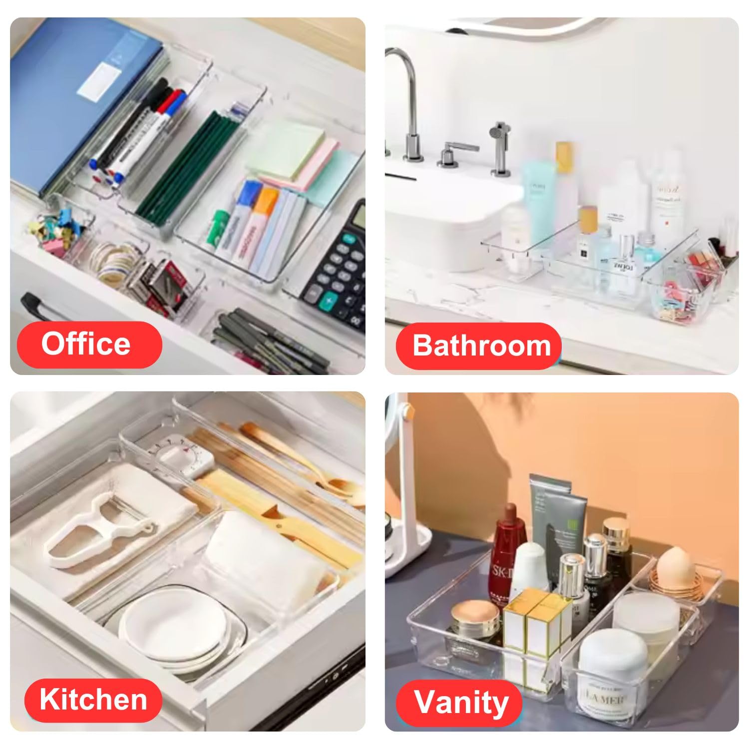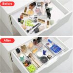 Make Everything Organized: These transparent versatile drawer dividers trays are perfect for any place in your home. Fit all kinds of drawers, such as vanity / bathroom / kitchen / office drawers/ craft room, ideal for organizing cosmetics, makeup tools, hair accessories, jewelry, pins, office supply, craft supplies, utensils, etc.