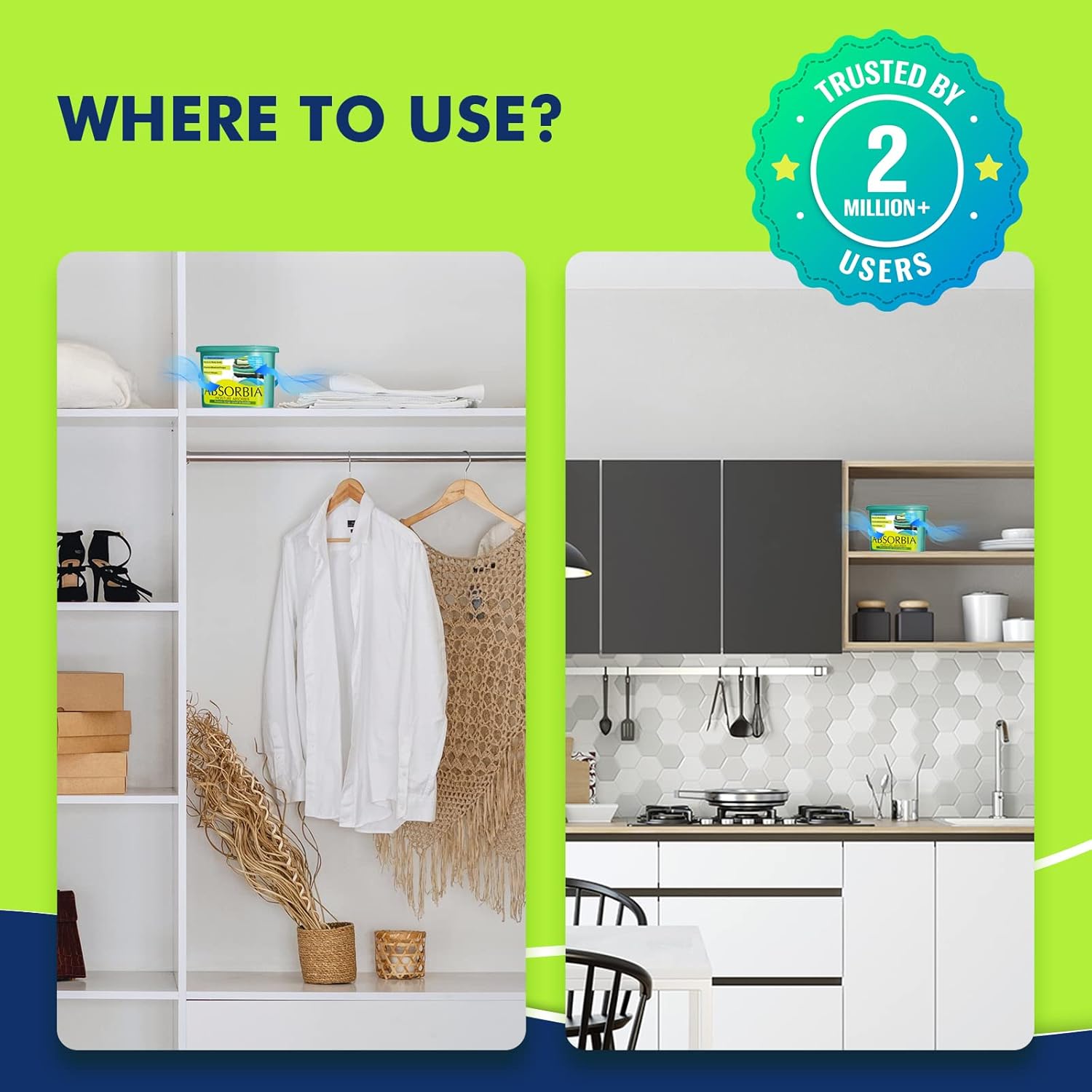 CAN BE USED ANYWHERE – Absorbia moisture absorber is suitable to keep in rooms, kitchen, shoe cabinets, and other storage spaces that need to be kept fresh and odour free. Moreover, this dehumidifier is spill proof and easy to place.