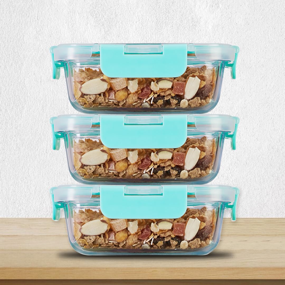 Allo Foodsafe Glass Containers With Lids, Lunch Boxes For Office, Microwave Safe Containers, Borosilicate Meal Prep Glass Food Storage Containers For Kitchen, Set Of 3, 370Ml, Transparent