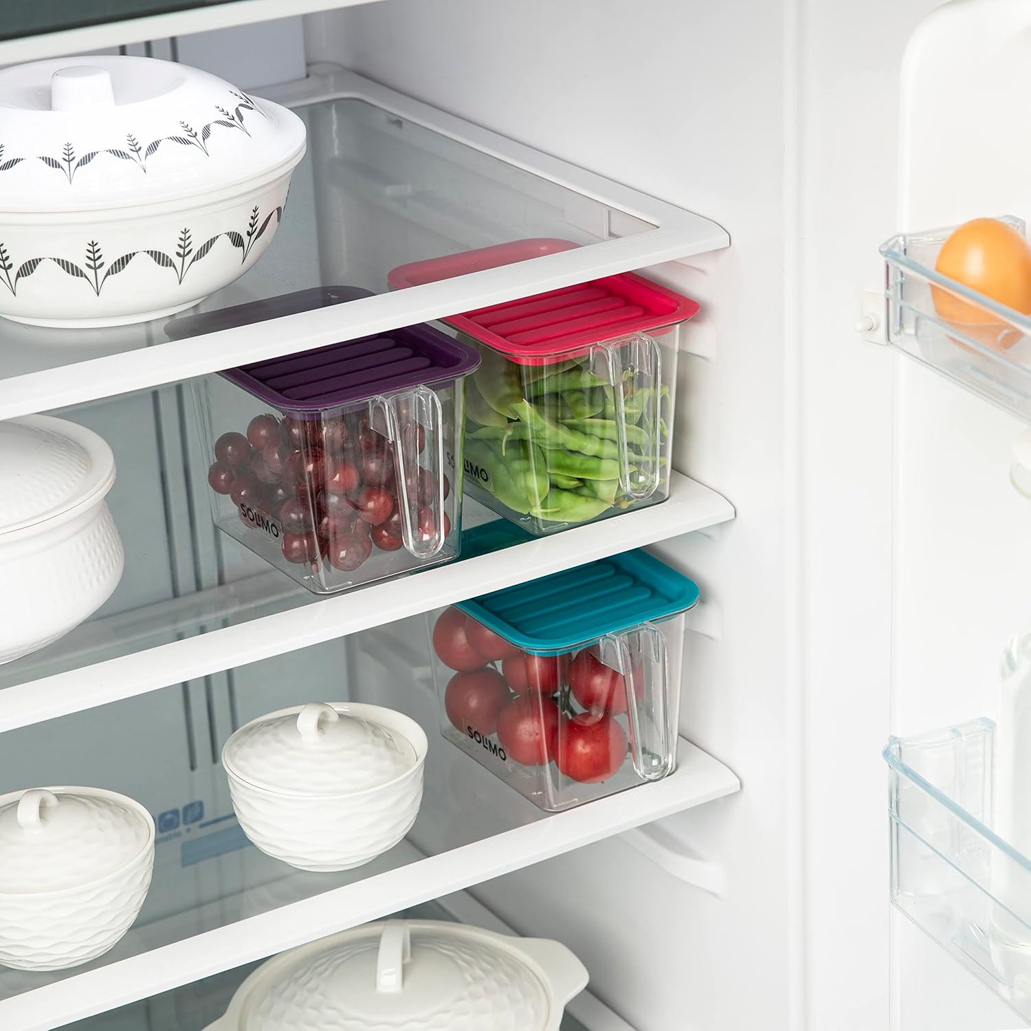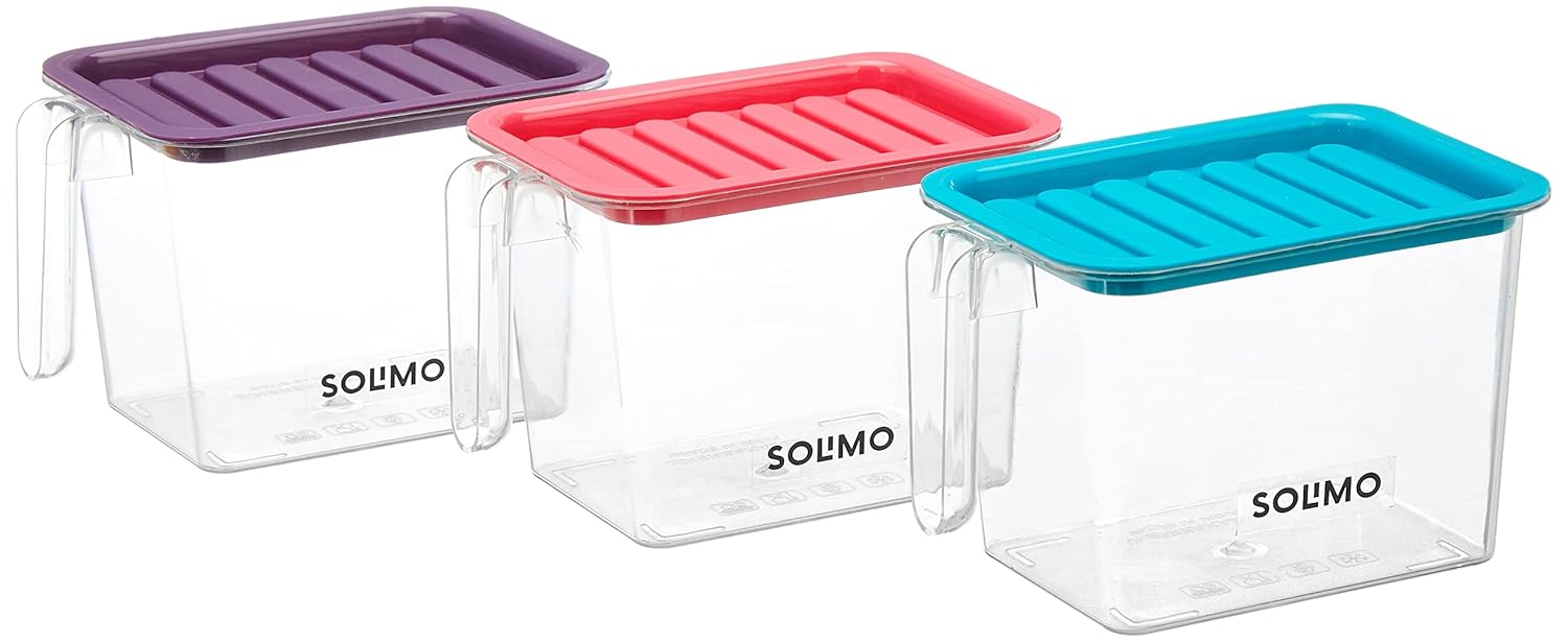Amazon Brand – Solimo Plastic Multi-Purpose Fridge Storage Container with Handle & Lid |Set of 3 | Fruit & Vegetable Basket | BPA Free | Food Grade | 1100 ml | Multicolour