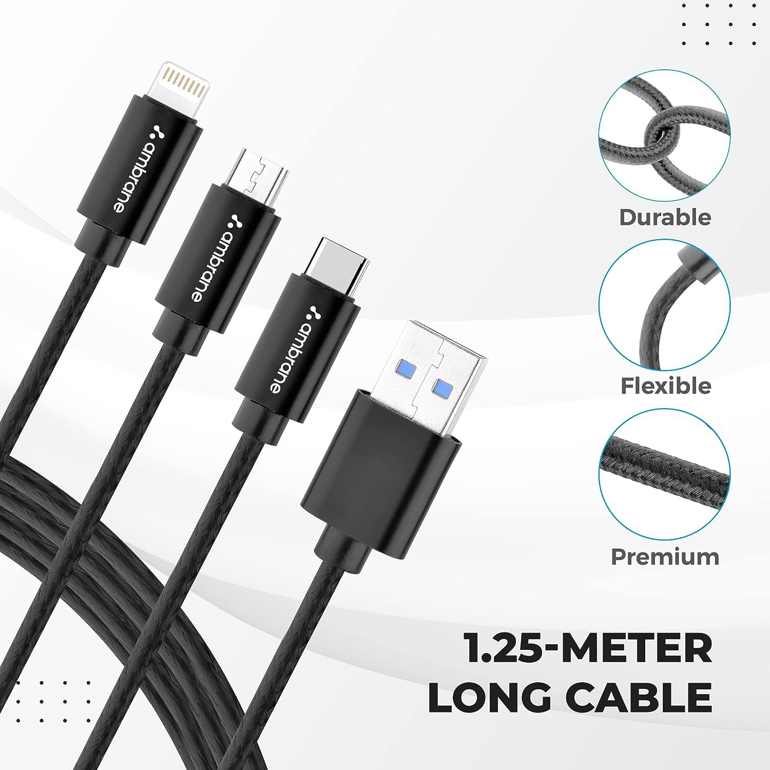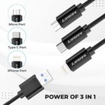 Ambrane Unbreakable 3 in 1 USB Fast Charging USB Cable with Type C, Lightning, Micro USB Port with 2.1 A, Compatible with iPhone, iPad, Samsung, OnePlus, Mi, Oppo, Vivo, Xiaomi, 1.25M (Trio-11, Black)