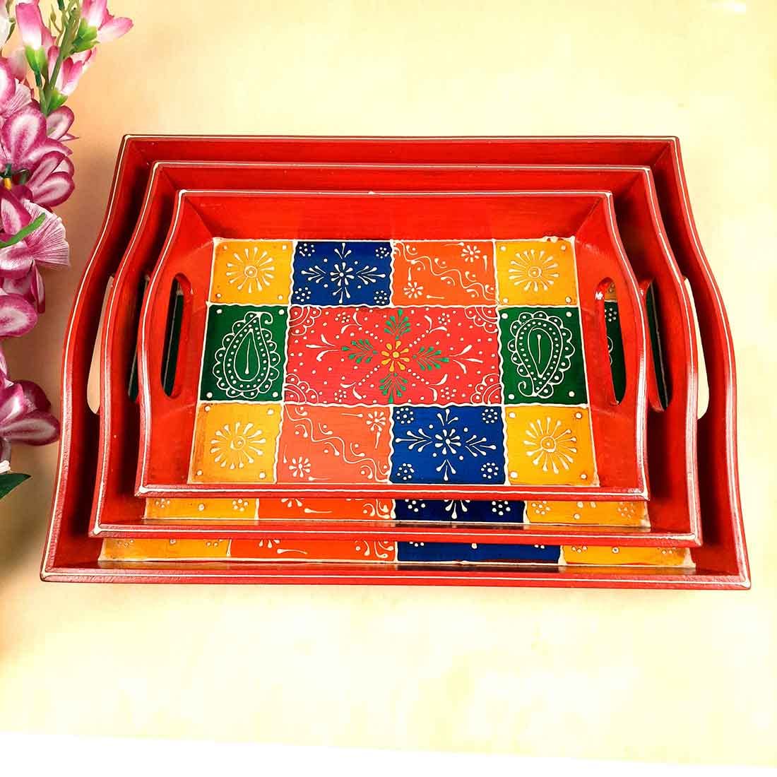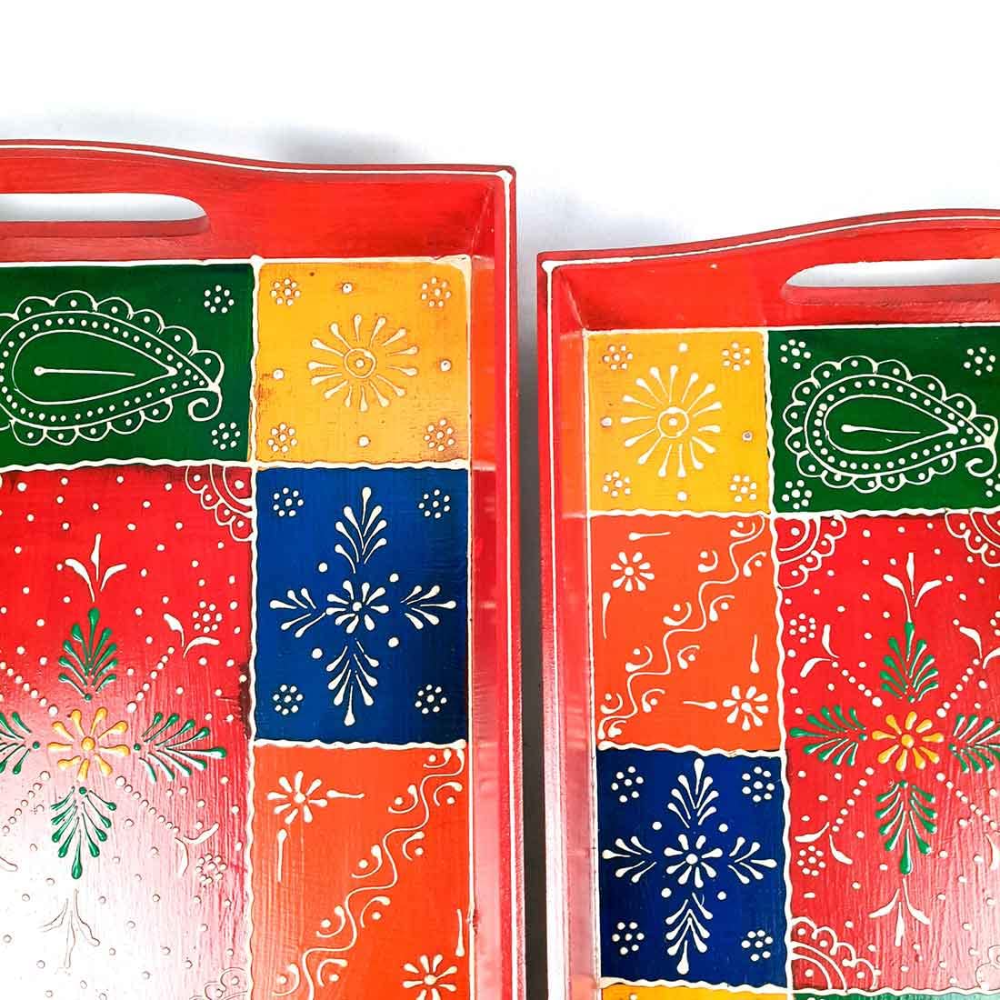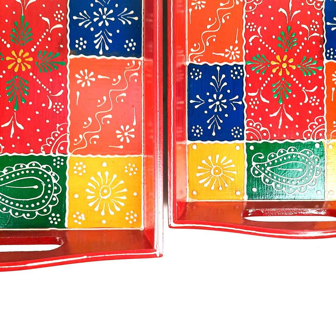 Special Feature: Beautiful set of handcrafted trays. Made of wood the trays are handpainted with beautiful designs giving them an ethnic look. Great gift for your loved ones. Adds Elegance To Your Kitchen, Bar, Bedroom, Dining Area, Family Room, Patio, Garden, Tea Or Coffee Lounge.
