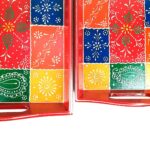 Trays are made out of wood and hand painted with beautiful strokes of vibrant and vivid shades which will make your kitchen pop. They have high sides which protect and prevent small things from falling off. The square handles in each side makes it convenient to hold and serve easily.