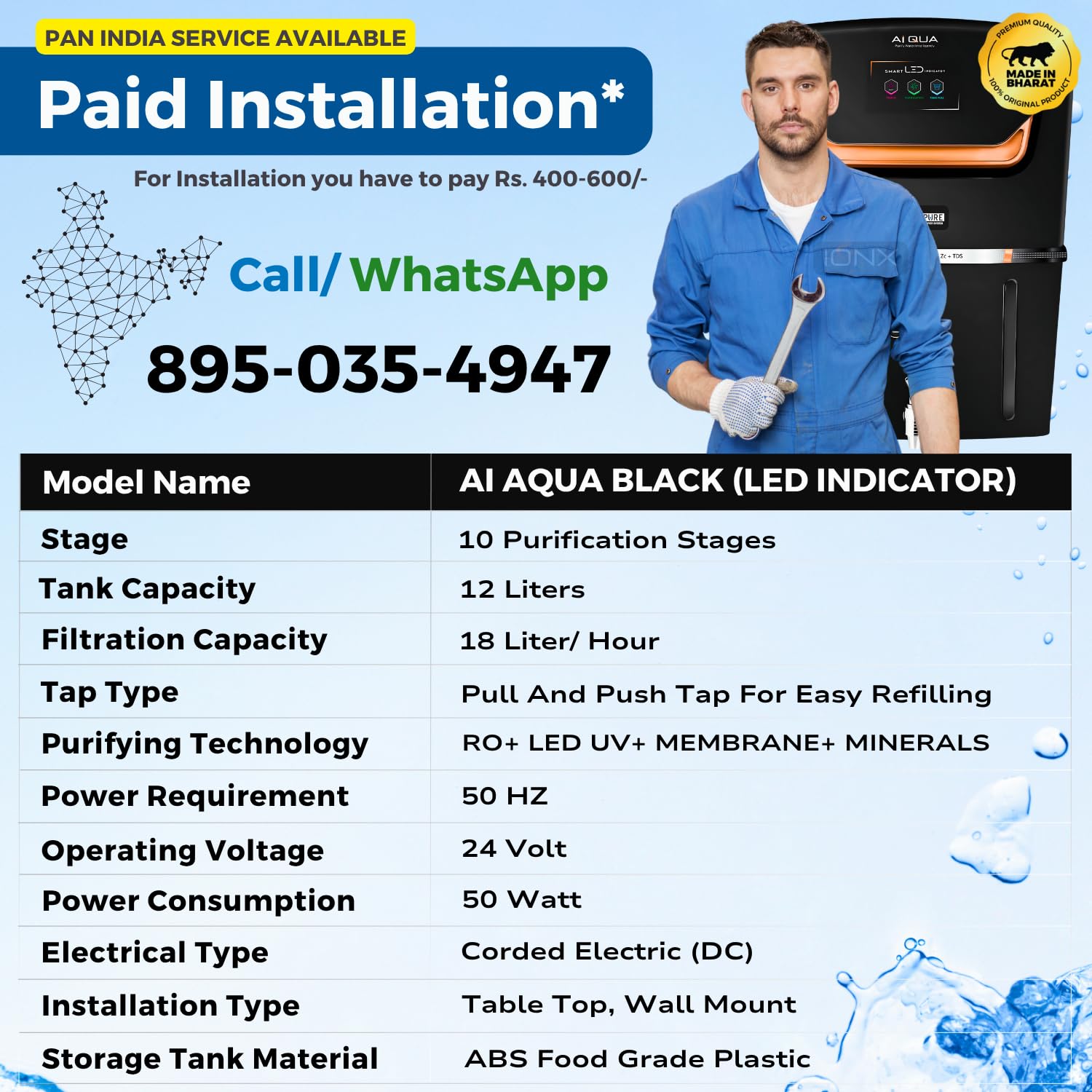 AI Aqua Black Premium RO Domestic Water Purifier for Home/ Office Purpose.