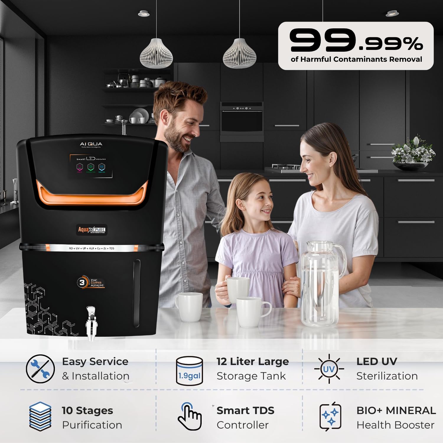 Aqua X Pure® Ai Black Premium RO Domestic Water Purifier | 5-in-1 Health Booster | 10 Stage Purification | 18 LPH | Smart LED Indicator | HIGH TDS MEMBRANE- Engineered for all Water Supply (0-3000ppm)