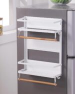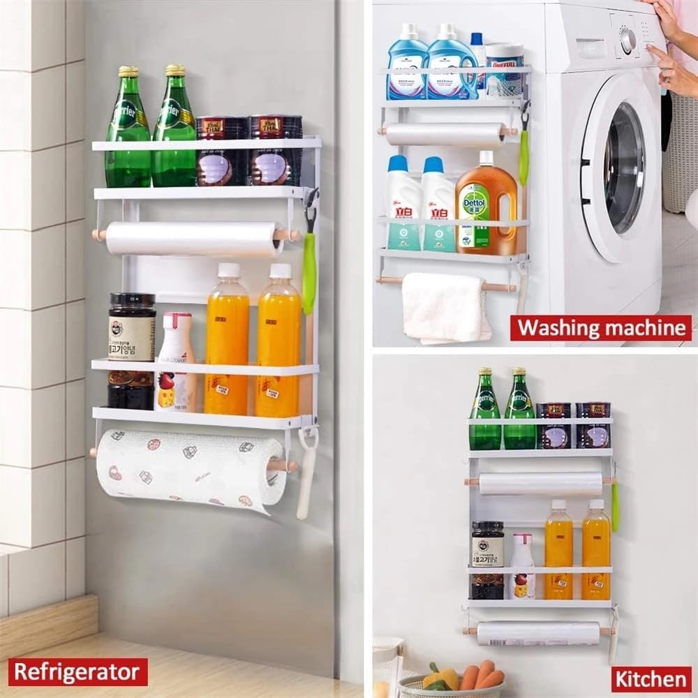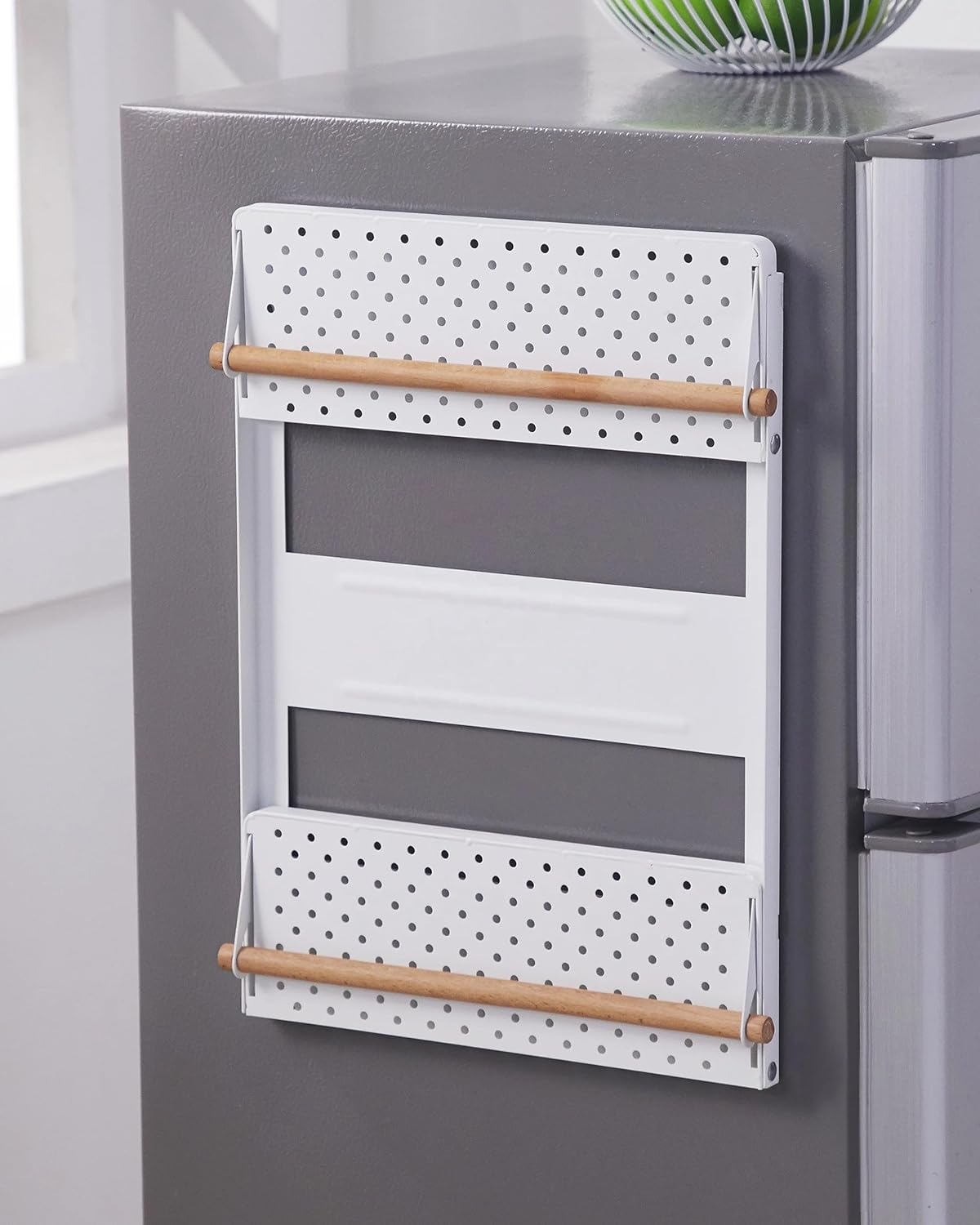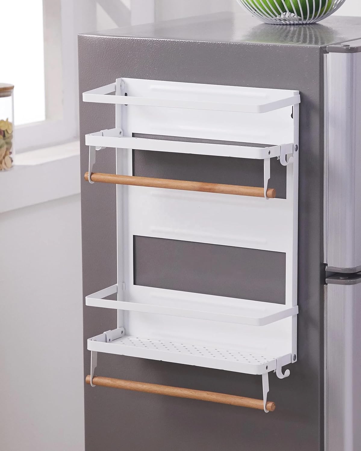 Arhat Organizers Magnetic Storage For Fridge|Two Shelf Magnetic Kitchen Rack|Foldable Double Magnetic Refrigerator Shelf With Hooks & Towel/Tissue Holder- Wall Mount/Hanging Shelves(White) – Metal