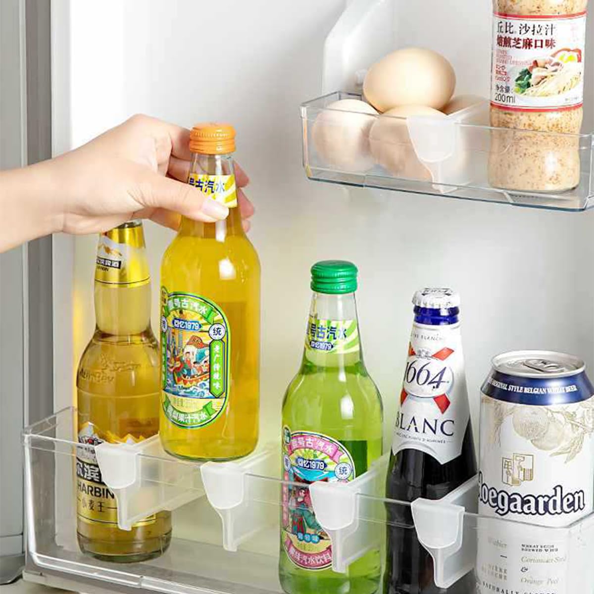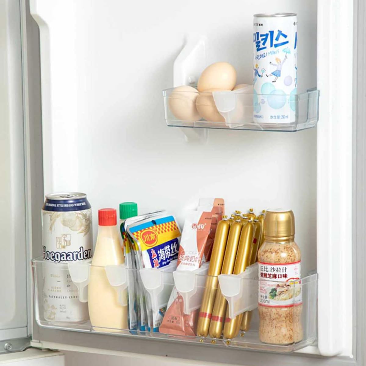 Fridge storage divider clips make the refrigerator door say goodbye to full of sundries and keep it clean and orderly, so that you can easily find the food ,drinks or seasoning you need; Compared with the storage box, it doesn’t occupy any space and doesn’t need to be measured carefully, the dividers are almost invisible;It is stable,cold and heat resistant,compact.
