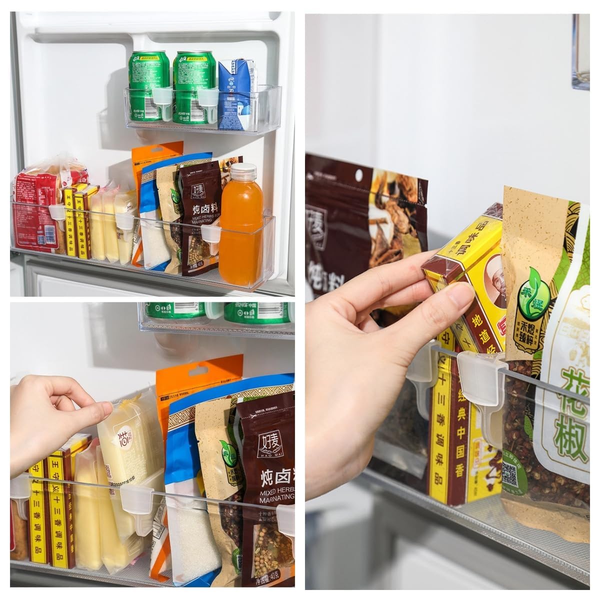 【Effective Solutions】Fridge storage divider clips make the refrigerator door say goodbye to full of sundries and keep it clean and orderly, so that you can easily find the food ,drinks or seasoning you need; Compared with the storage box, it doesn’t occupy any space and doesn’t need to be measured carefully, the dividers are almost invisible;It is stable,cold and heat resistant,compact.