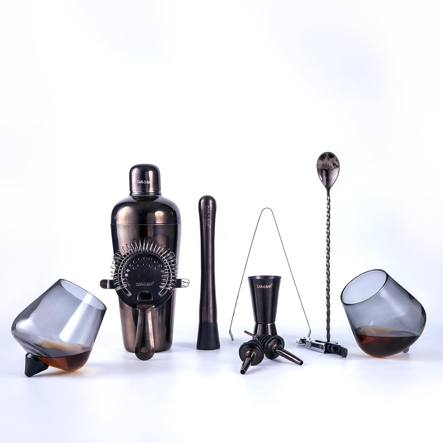Premium Gun Metal Colour Stainless Steel Construction: Crafted from high-quality, food-grade stainless steel, each bar accessory in the Car-O-Bar Bar Set | Bar kit ensures durability and long-lasting performance.