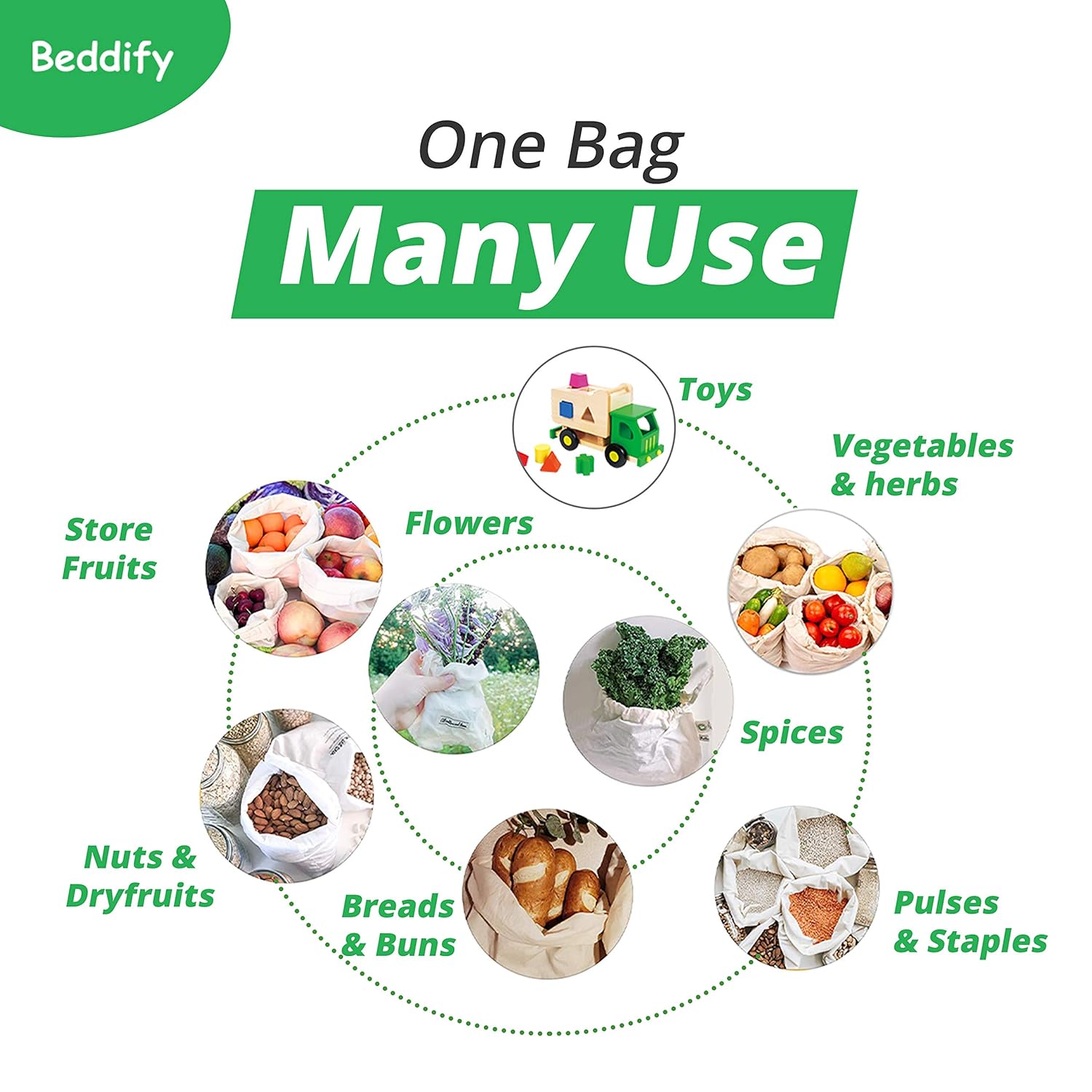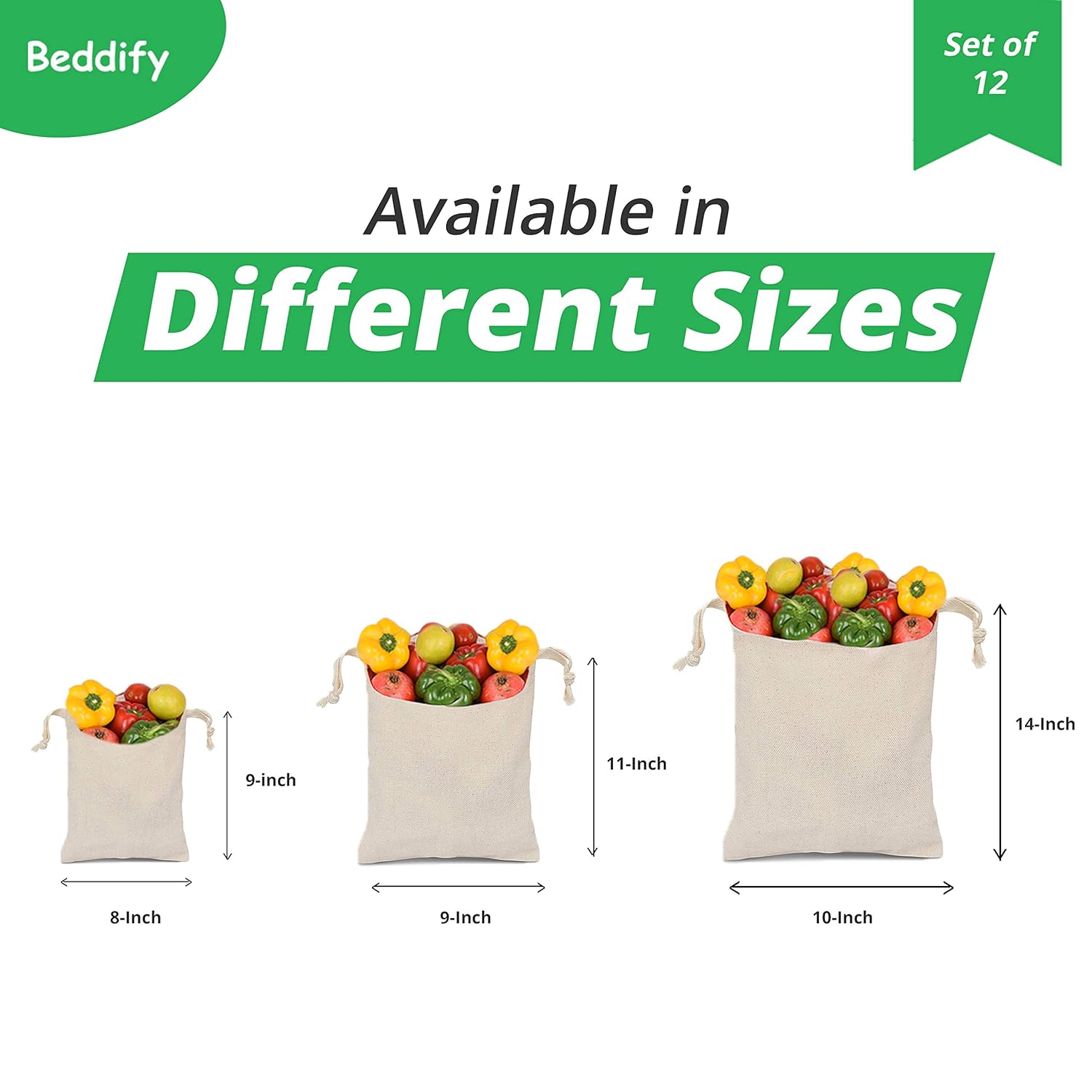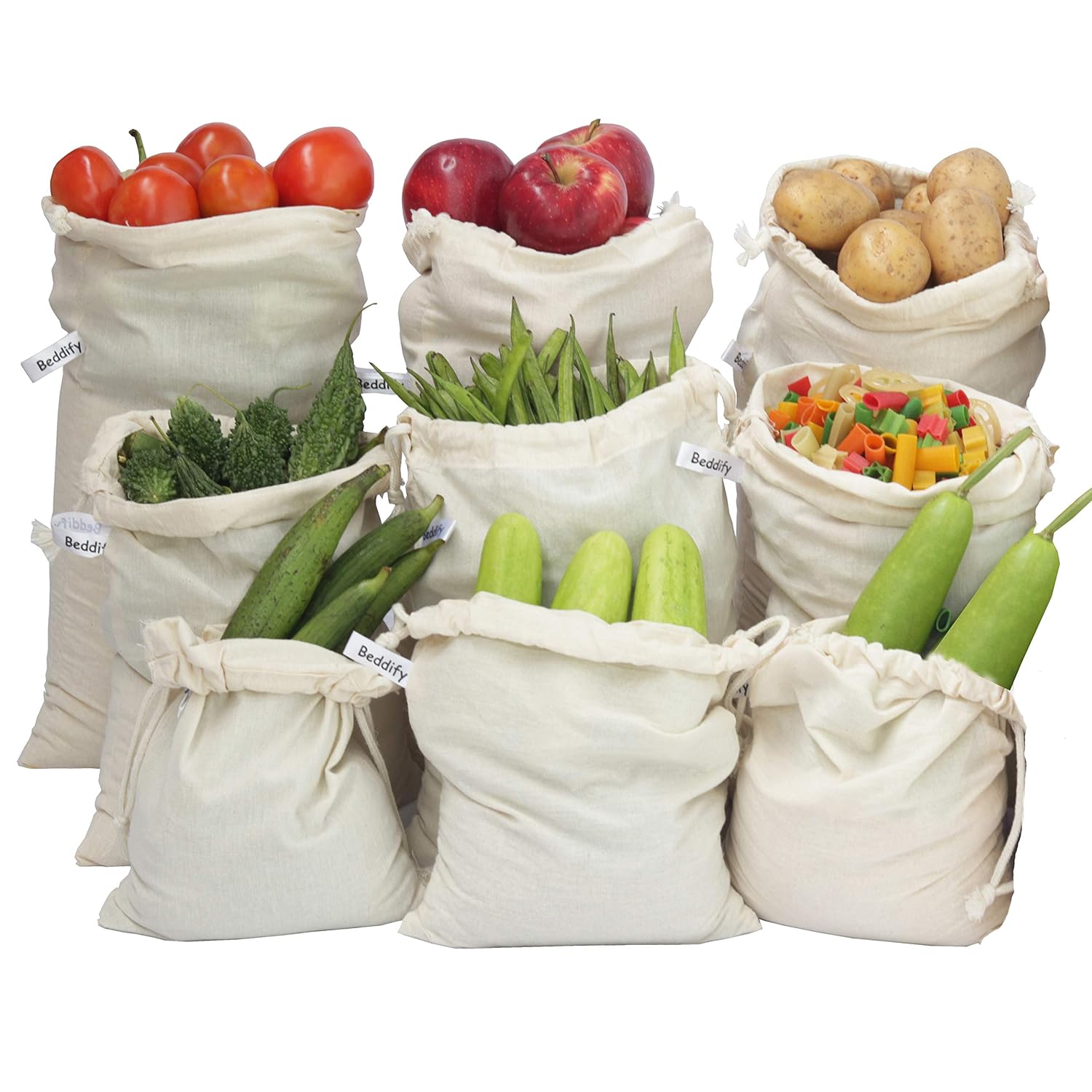 Beddify 100% Cotton Set of 9 Reusable Fridge Storage Bags for Vegetables and Fruits Multipurpose Drawstring Eco Friendly Bags (3 Large, 3 Medium & 3 Small Size Bags)