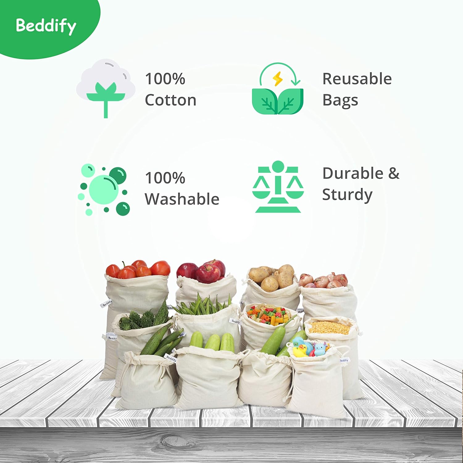 8 reviews for Beddify 100% Cotton Set of 9 Reusable Fridge Storage Bags for Vegetables and Fruits Multipurpose Drawstring Eco Friendly Bags (3 Large, 3 Medium & 3 Small Size Bags)