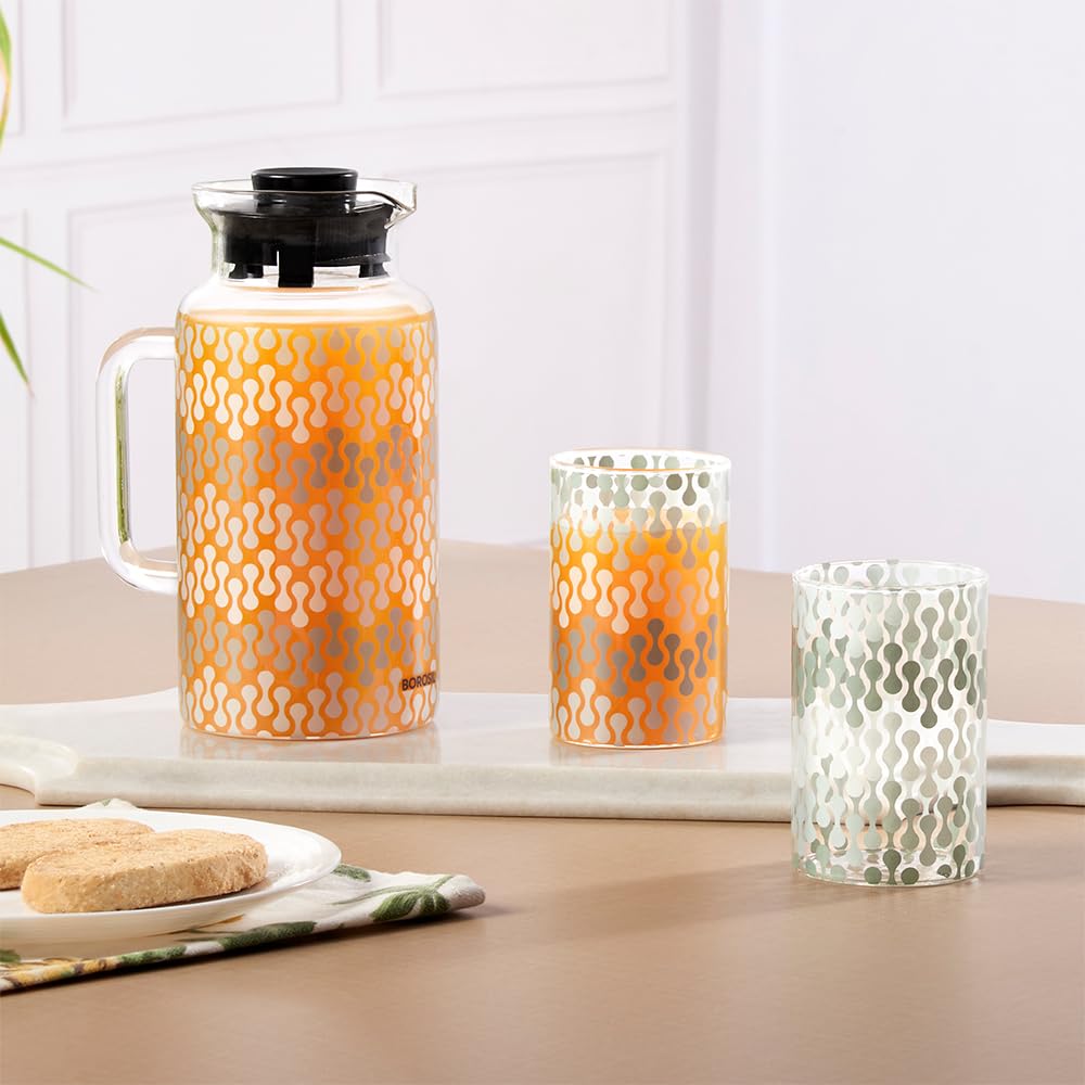 Borosil Artisan 1000ml Multipurpose Jug with 2 pc Medium (295 ml) Glass Set | 100% Borosilicate, Fridge & Freezer, Dishwasher Safe | Glass Jug with Tumbler | Transparent (Vistra)