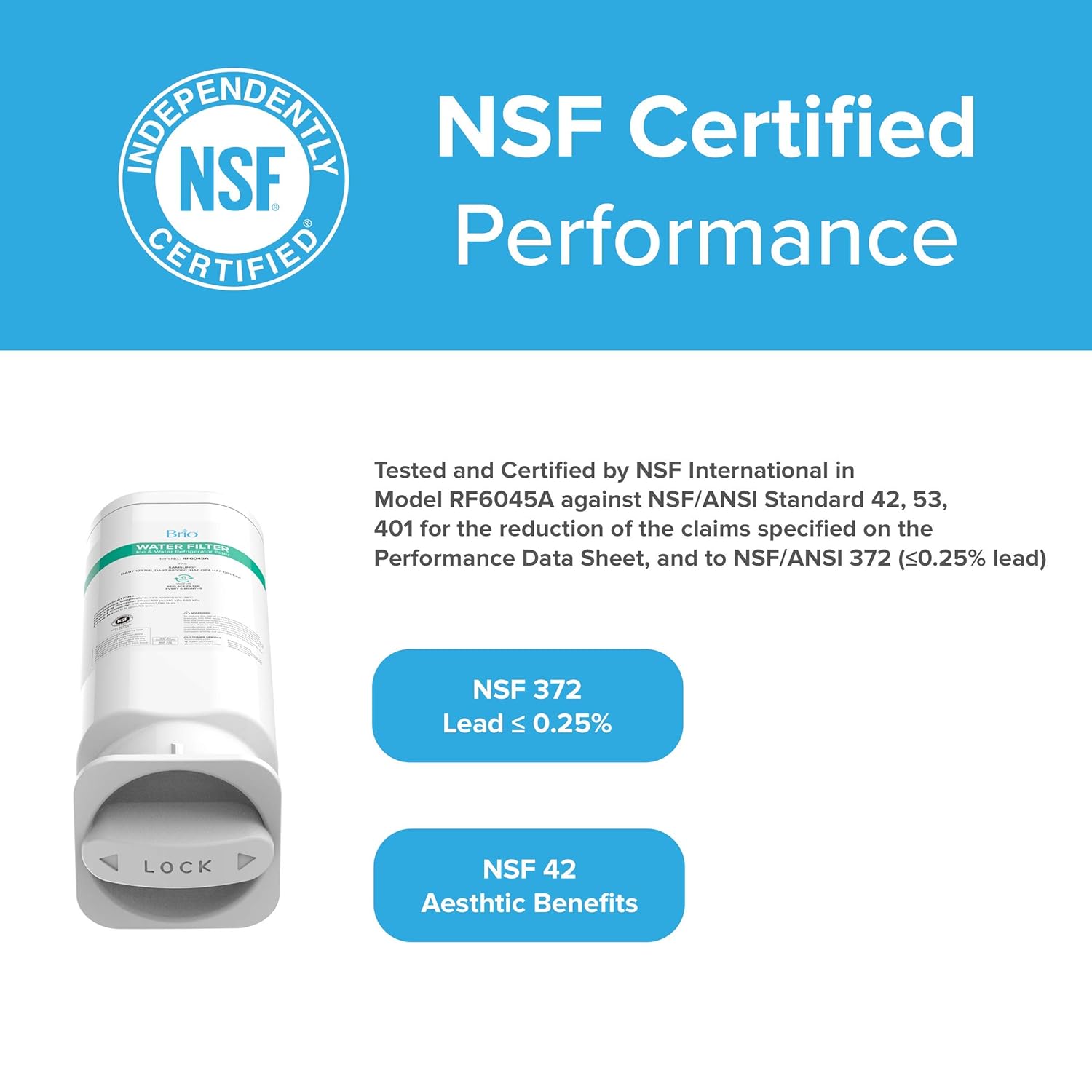 Brio 6045A refrigerator water filter replacement for Samsung, DA97-17376B, DA97-08006C, HAF-QIN, HAF-QIN/exp delivers refreshing filtered water, straight from your refrigerator unit. Designed with simple maintenance in mind, the advanced filters have a lifespan of 6 months and do not require any tools for installation to provide you with effortless maintenance and utilization. The leak-proof, carbon shell filters absorb twice as many impurities as alternatives, leaving you with cleaner looking, smelling, and tasting water. The filters have been awarded several national sanitation foundation certifications for their superb health benefits and ability to remove an array of harmful contaminants.