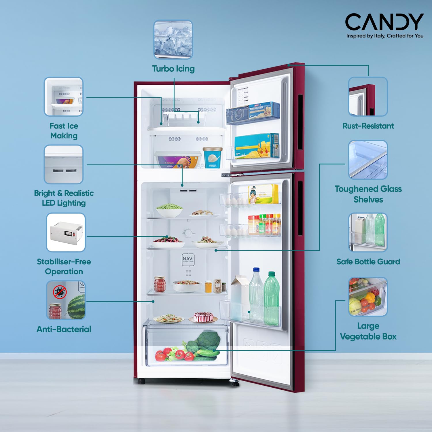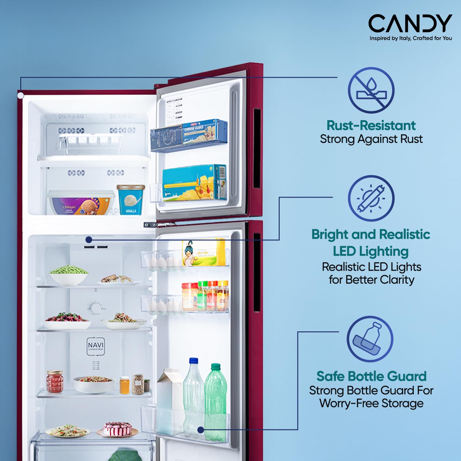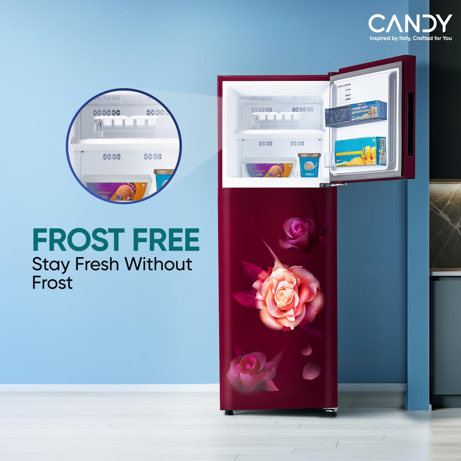 Frost Free Refrigerator: Elegant Red Blaze Look ,Premium Auto Defrost with powerful cooling and long lasting freshness and performance.