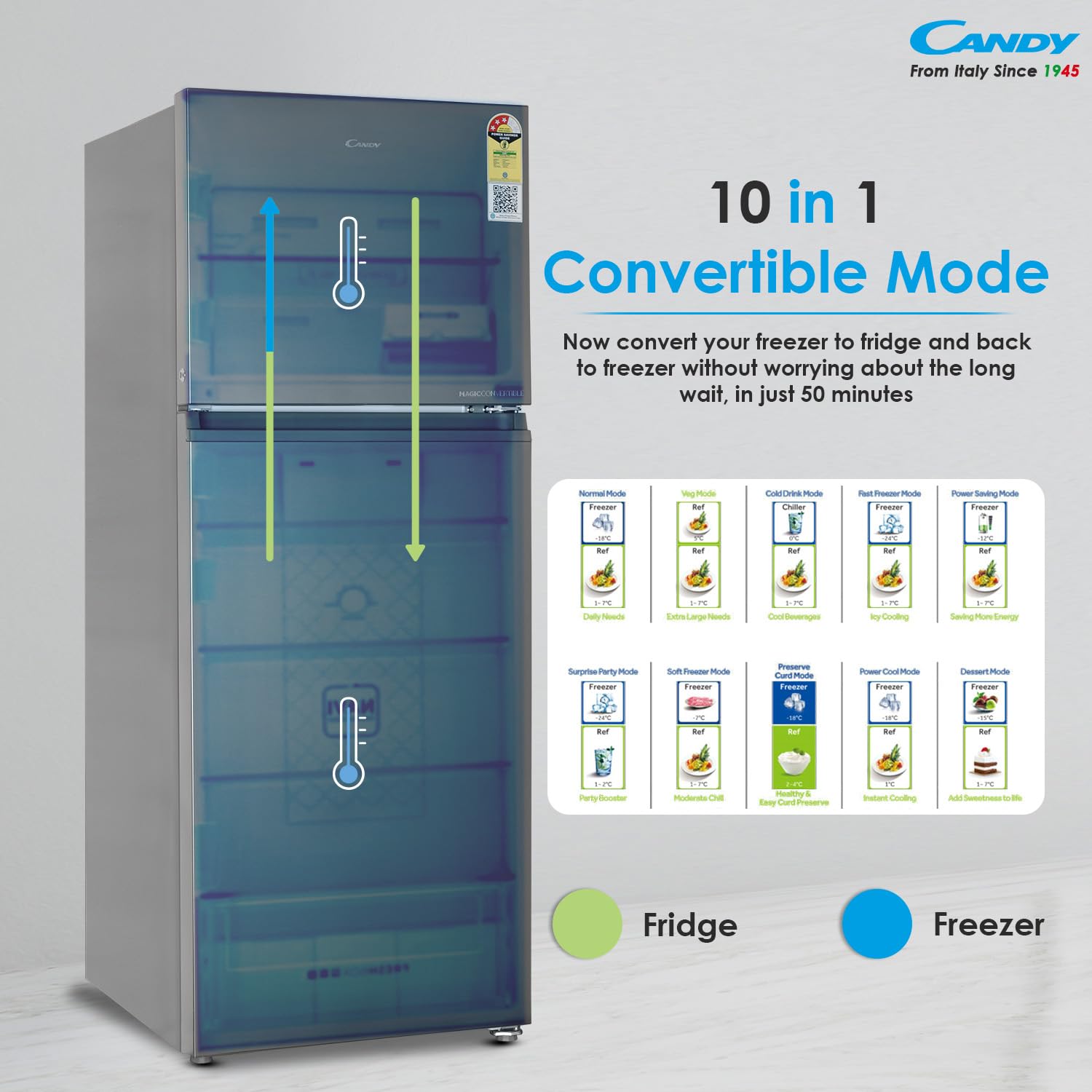 Experience ultimate flexibility with this innovative Candy 328L double door refrigerator featuring groundbreaking 10-in-1 convertible technology. Transform your freezer compartment to additional fridge space and back in just 50 minutes, adapting to your changing storage needs. The triple inverter technology ensures efficient cooling while the frost-free design eliminates tedious manual defrosting. A convenient twist ice maker lets you prepare ice quickly, while the dual fan motor technology maintains consistent temperature throughout. The sleek Moon Silver finish adds sophistication to any kitchen. Multiple modes including Normal, Veg, Cold Drink, Fast Freezer and Power Saving cater to diverse storage requirements. The spacious vegetable box keeps produce fresh longer. Featuring toughened glass shelves and precise thermostat control, this refrigerator combines functionality with durability. Backed by a comprehensive warranty of 1 year on product and 10 years on compressor, this refrigerator brings Italian engineering excellence to your home.