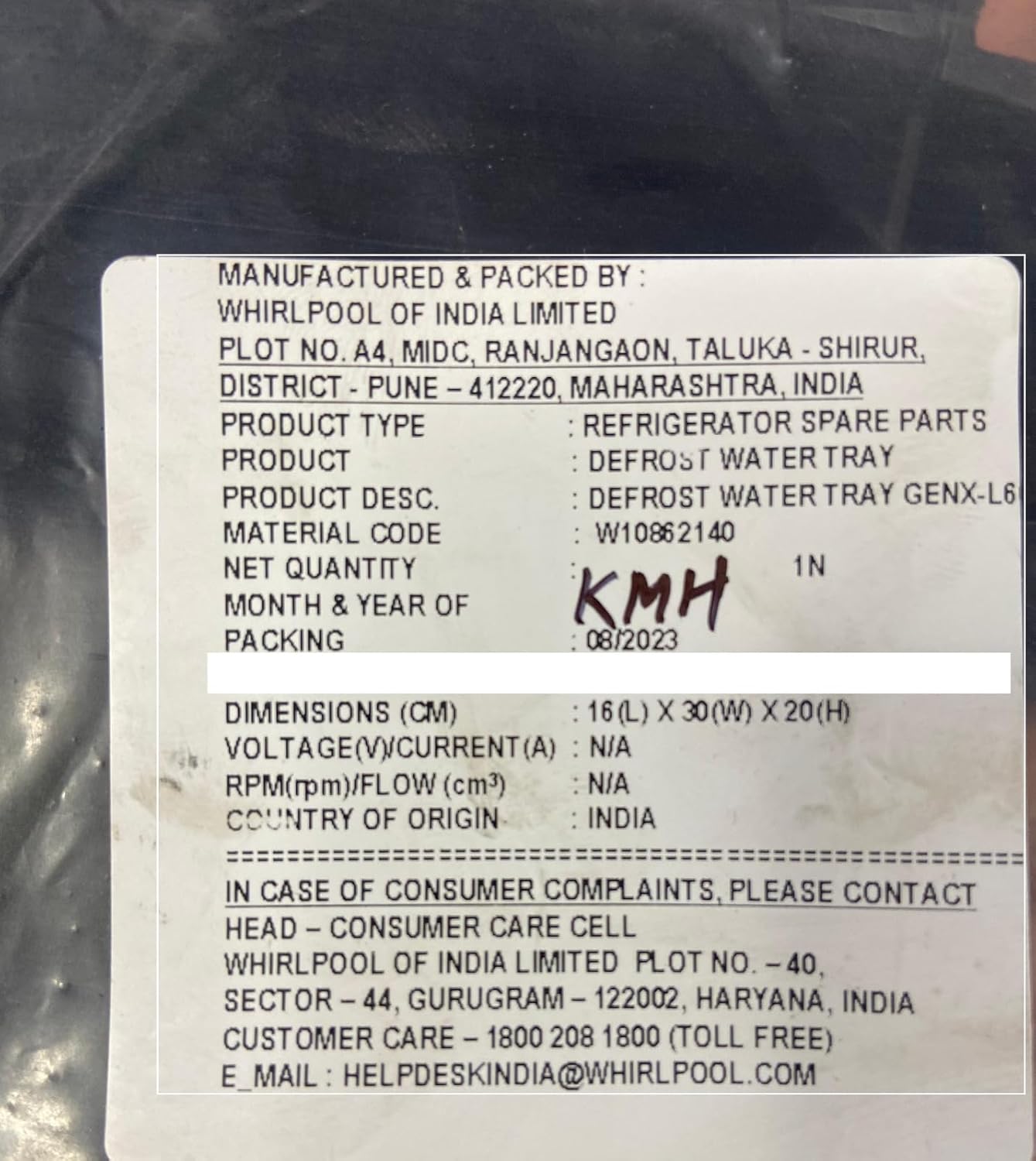 COMPRESSOR DEFROST TRAY COMPATIBLE WITH WHIRLPOOL DOUBLE DOOR GENX -L6 PART NO – W10862140 (MATCH & BUY)