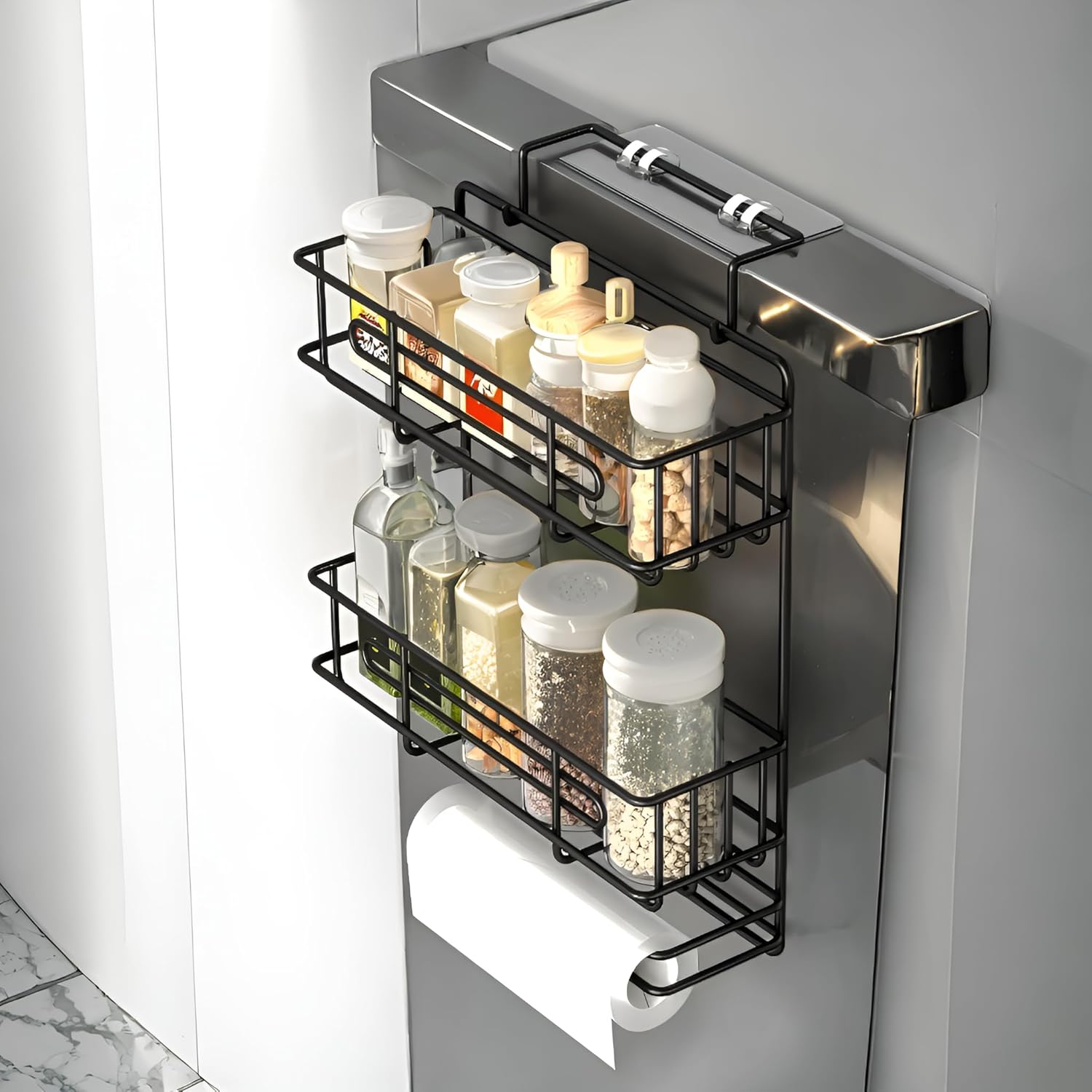 Decorlay Metal Self-Adhesive Refrigerator Side Kitchen Storage Rack Organizer with Napkin and Tissue Roll Holder, Space-Saving Storage, Black