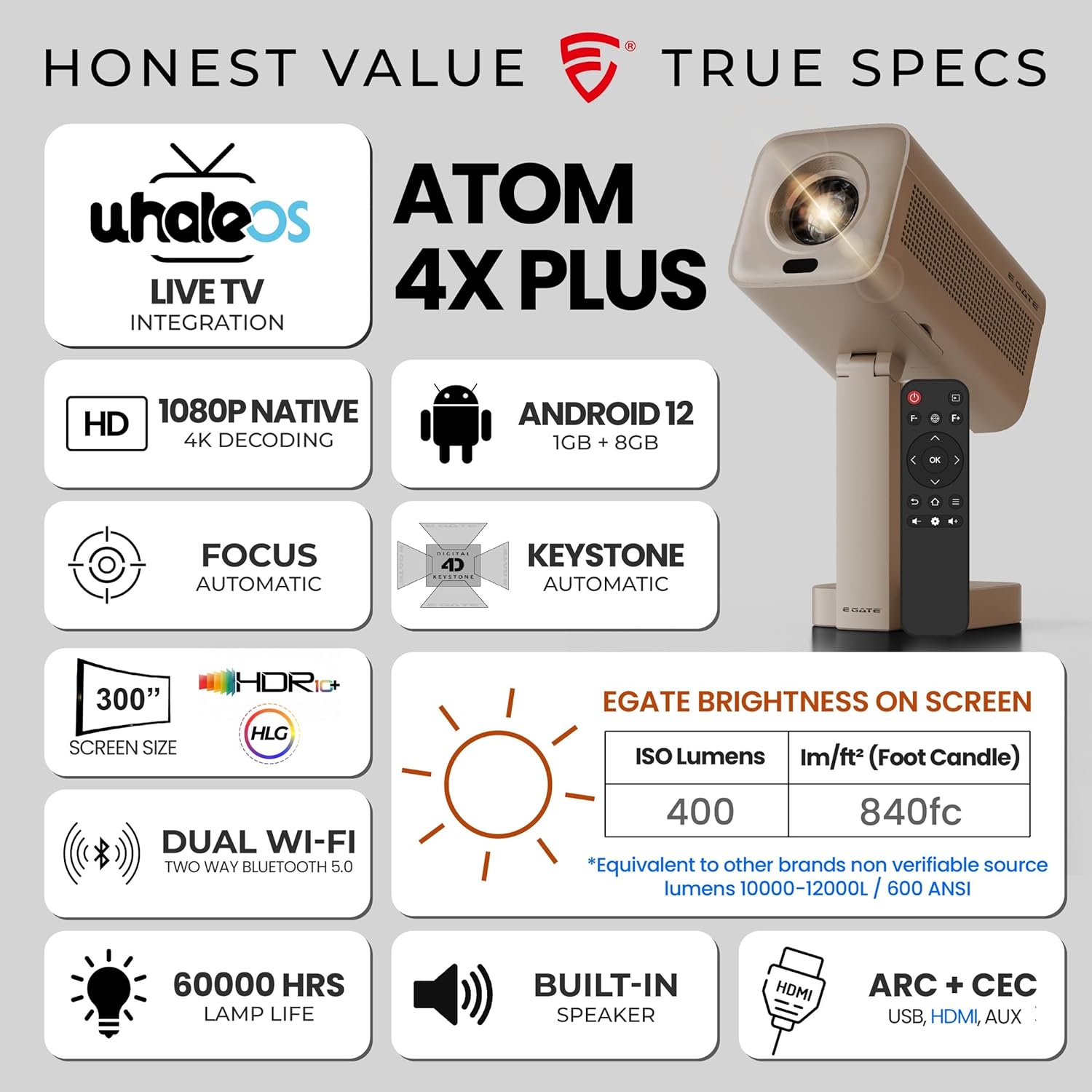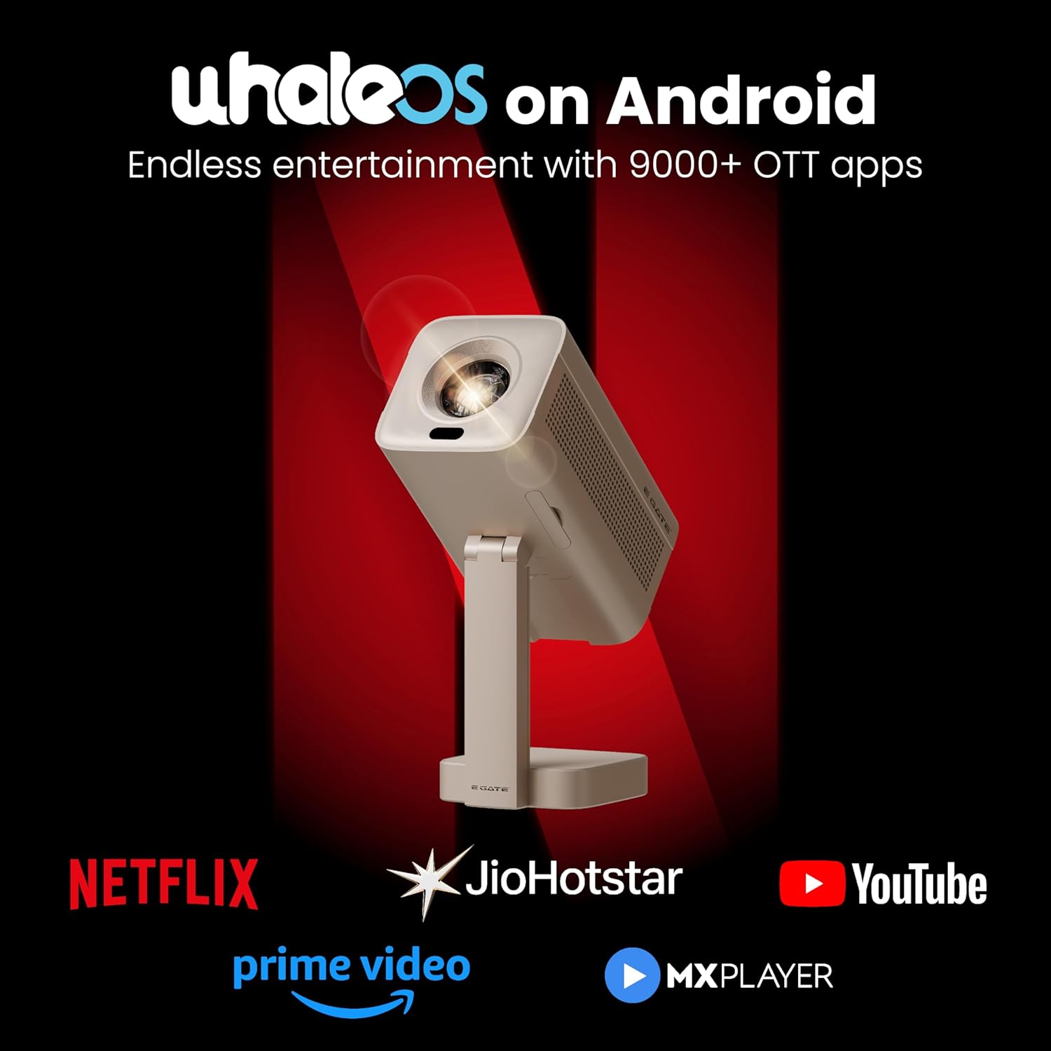 E GATE Atom 4X+ Fully Automatic Projector 4k Ultra HD | Whale TV+ Live TV on Android | Brightest 400 ISO | Native 1080p, Netflix, Prime | USB-HDMI ARC+CEC | HDR+HLG | WiFi 6, BT, Egate Projectors Gold