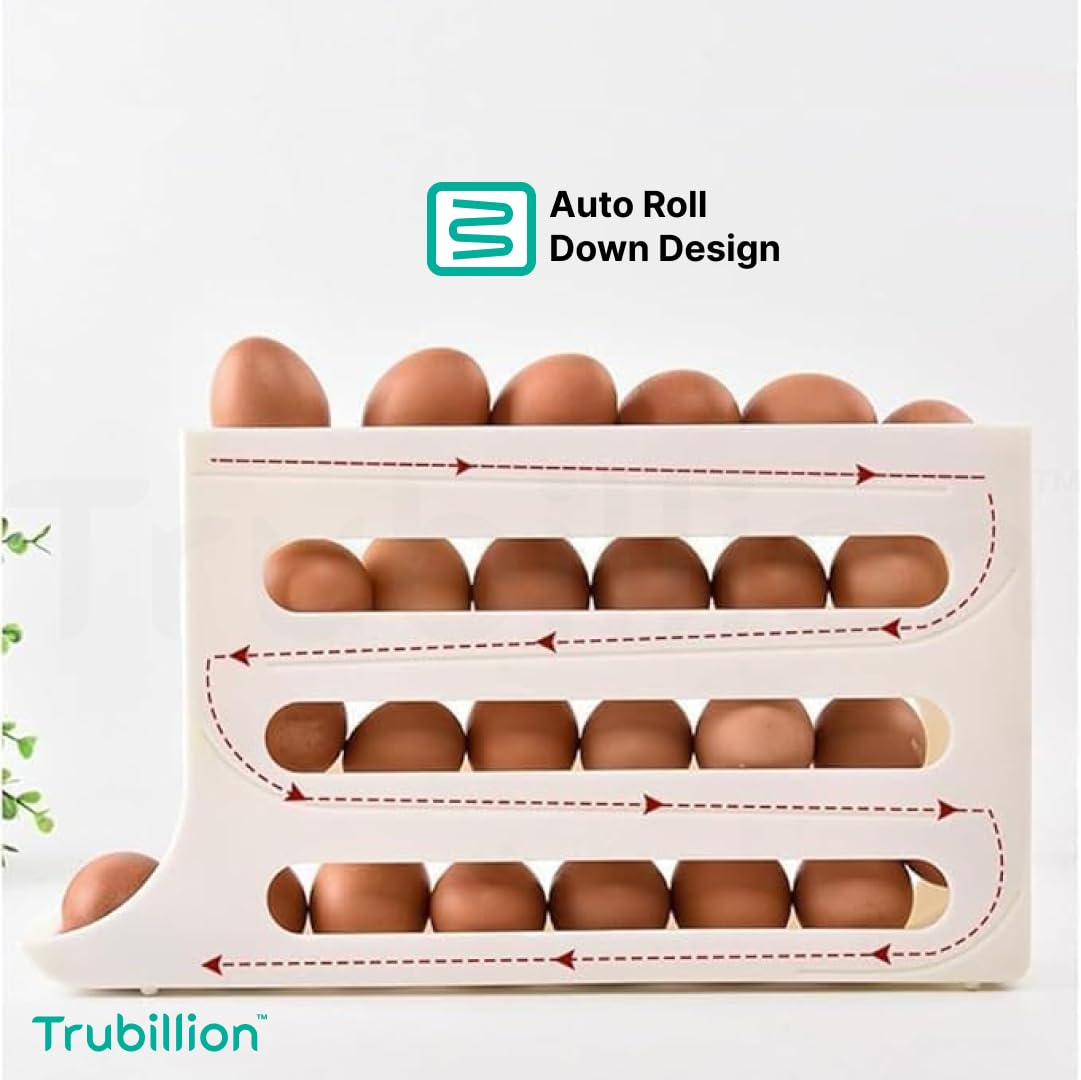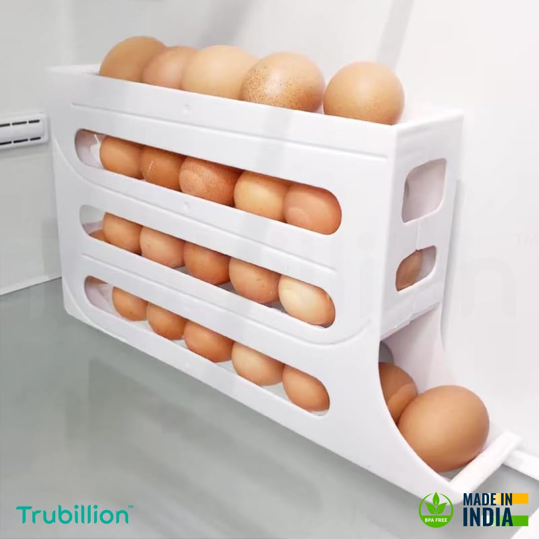 Introducing the EggRoller by TRUBILLION, a smart and stylish solution for organizing and storing your eggs with maximum efficiency and elegance. Designed for modern kitchens, this 4-tier egg dispenser features an innovative auto-rolling mechanism with a gentle slope, ensuring that eggs automatically roll down and replenish from top to bottom. With its ‘First In, First Out’ system, you can always access the oldest eggs first, keeping your stock fresh and ready to use. Crafted from high-quality, durable ABS material, the EggRoller is built to last. Its sleek white finish complements any kitchen décor, while the vertical storage design helps maximize space in your refrigerator. The large capacity holder is ideal for storing eggs in the fridge side door or on any tabletop, cabinet, or pantry shelf. Whether you’re a home cook or managing a busy restaurant or café, this multipurpose organizer fits right in with its functional and space-saving appeal. Forget the mess and clutter. EggRoller keeps your eggs neatly arranged and easily visible, so you never lose track. It requires no installation and is simple to use straight out of the box. Plus, it’s BPA-free and freezer safe, making it a safe and hygienic choice for food storage. Easy to clean and maintain, this egg tray is as practical as it is innovative. Proudly made in India, the EggRoller by TRUBILLION brings convenience, organization, and a touch of modern design to your kitchen, making it the ultimate egg storage solution for any household or commercial space.