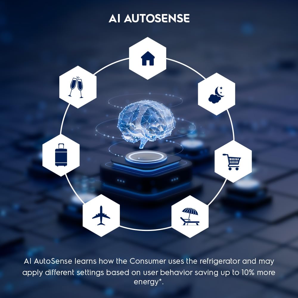 AI Autosense: Using Artificial Intelligence, AI AutoSense optimises double door refrigerator operation and saves up to 10% more energy*. It identifies your household’s usage patterns and automatically adjusts fridge settings accordingly. AI AutoSense rearranges defrosting time, reduces fan speed at night for less fridge noise.
