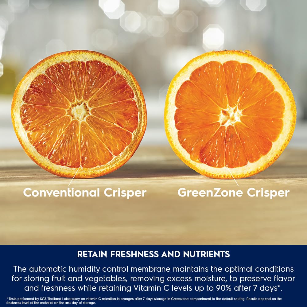 Retain Freshness and Nutrients: Keep your produce fresher for longer in the sealed GreenZone drawer. The automatic humidity control membrane maintains the optimal conditions for storing fruit and vegetables, removing excess moisture and reducing condensation, to preserve flavour and freshness while retaining Vitamin C levels up to 90% after 7 days*.
