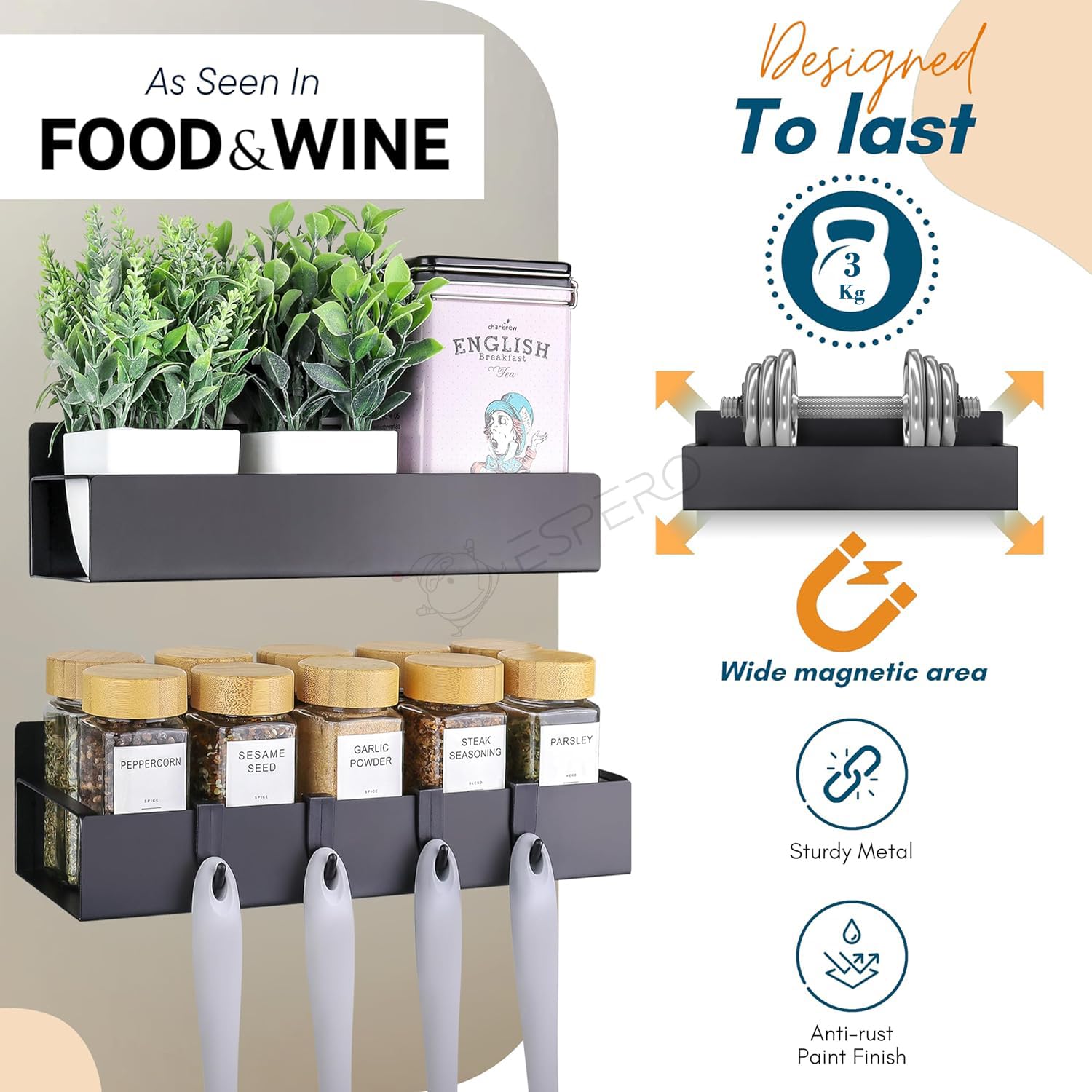 PREMIUM RUSTPROOF CONSTRUCTION: Made with high-quality carbon steel and featuring a durable rust-resistant coating, this magnetic spice rack ensures long-lasting performance.