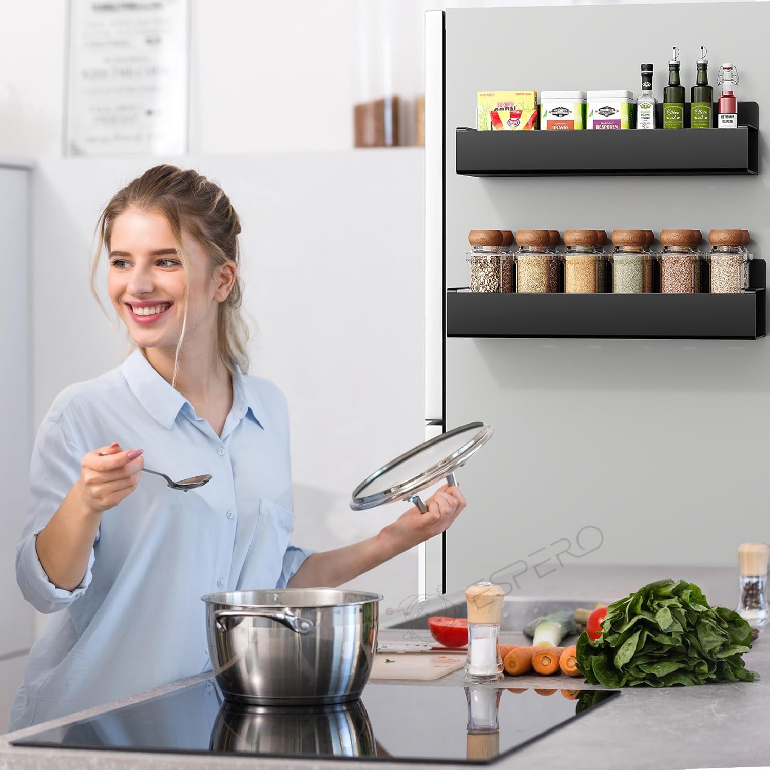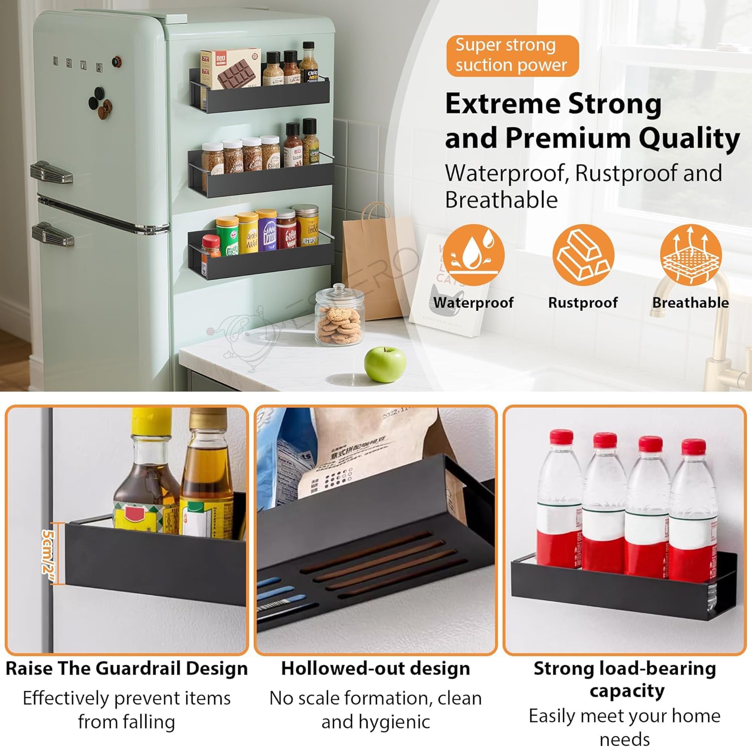 STRONG MAGNETIC PUNCH-FREE INSTALLATION: Innovative magnetic spice rack for Refrigerator. with built-in strong magnet design, it only needs to be directly adsorbed on the side of the refrigerator, without drilling or gluing. Easy to install and move, without damaging the surface of the refrigerator.