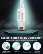 The flexible Cat6 Ethernet cable features a durable outer PVC jacket for protection and RJ45 connectors with gold plating for accurate data transfer and corrosion-free connectivity.