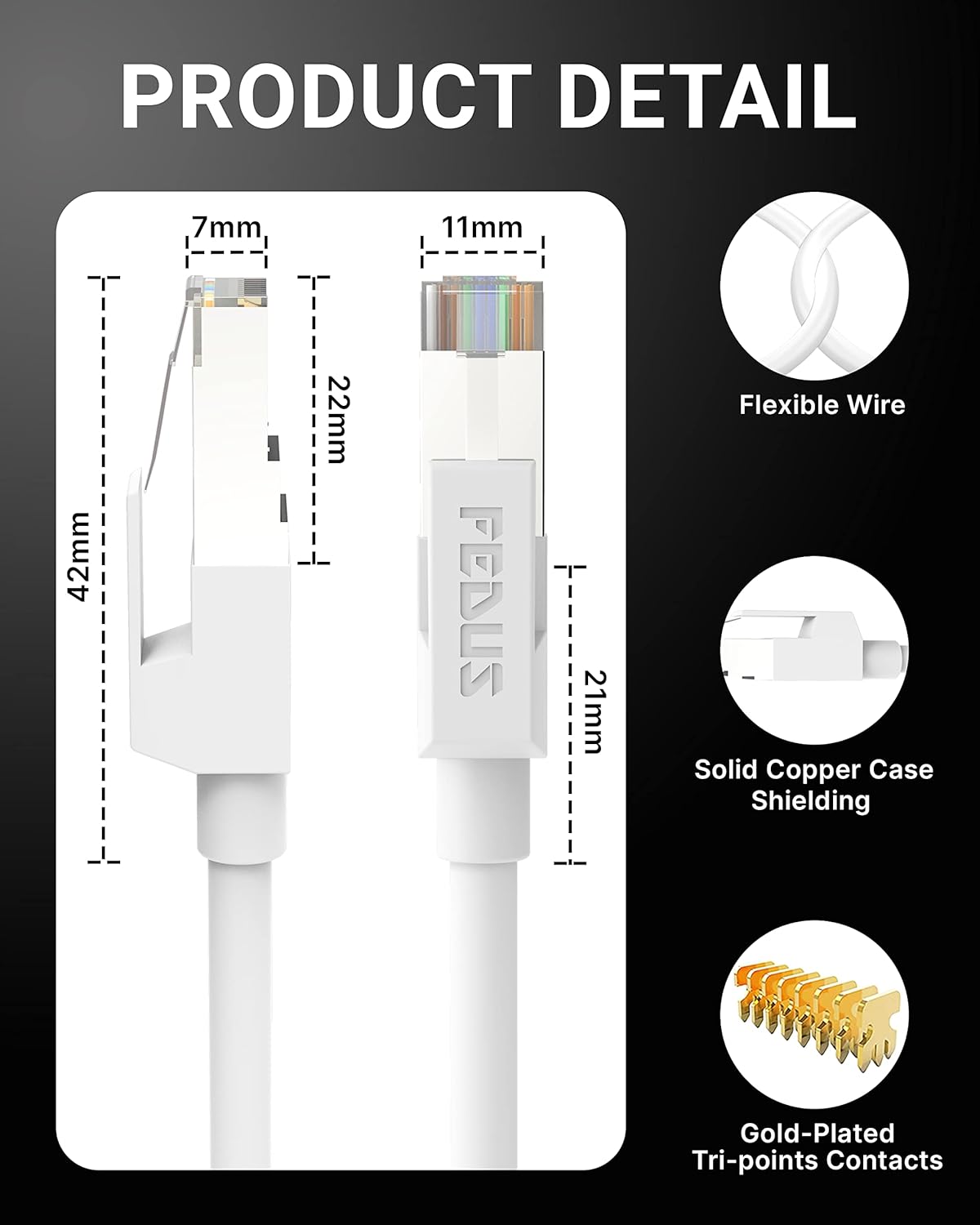 ✔️The connectors with gold-plated contacts, molded strain-relief boots, and snagless molds resist corrosion, provide durability, and ensure a secure connection; Copper Ethernet cables enhance cable performance and comply with specifications for communications cables