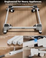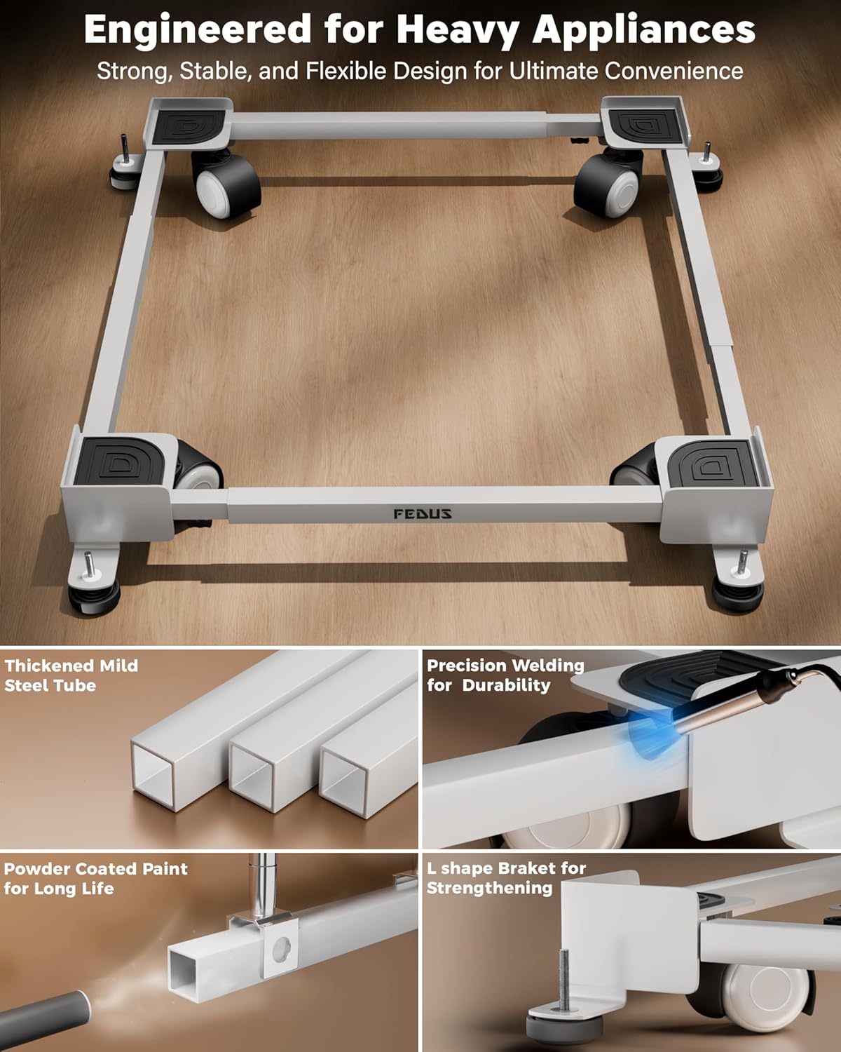 ▶ANTI-VIBRATION RUBBER PADS FOR STABLE MOVEMENT: Equipped with anti-vibration rubber pads at each corner, this trolley reduces vibrations and minimizes noise, ensuring a smooth and stable movement. The rubber pads also provide added grip, keeping your appliances secure, while preventing any movement or slipping during operation, making it ideal for sensitive appliances like washing machines and refrigerators.
