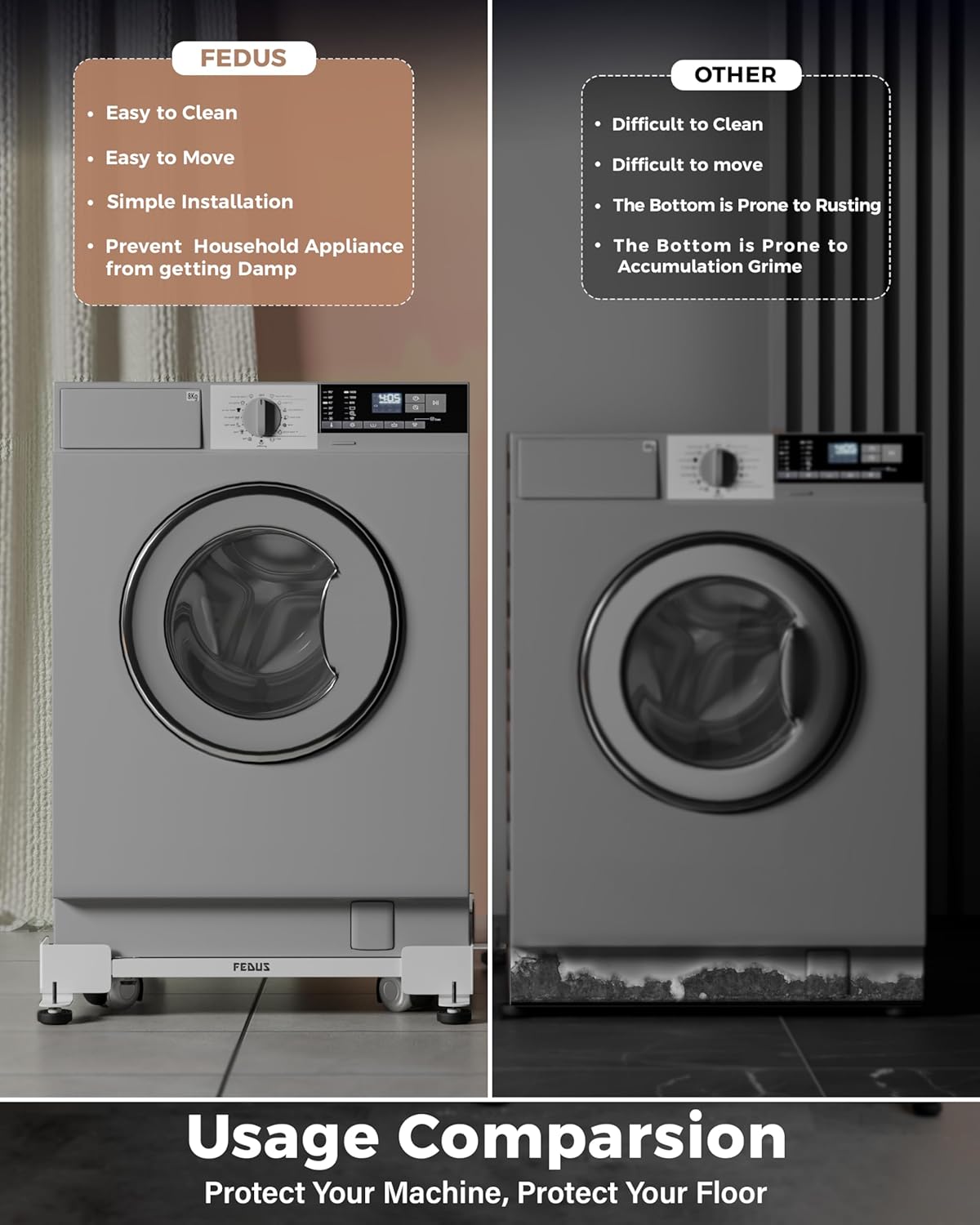 ▶HEAVY-DUTY CONSTRUCTION & ANTI-VIBRATION TECHNOLOGY: Unlike many other washing machine trolleys that struggle with vibrations, our movable trolley is built with a heavy-duty MS steel frame, ensuring maximum stability during high-vibration cycles. Most competitor trolleys shake along with the washing machine, causing instability and damage. To address this, we’ve incorporated anti-vibration pads at all four corners, absorbing vibrations and preventing them from transferring to the trolley.Rust and Peel Resistance with Heavy-Duty Powder Coating