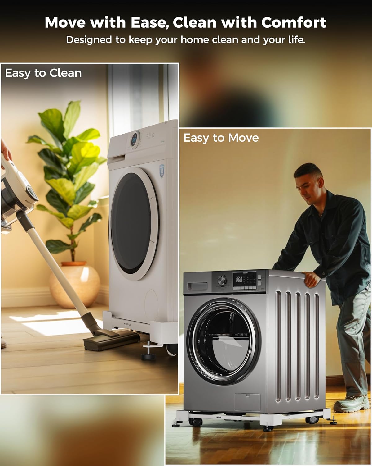 ▶EASY TO CLEAN UNDER THE TROLLEY, MAINTAIN A HYGIENIC HOME: The open-frame design of our washing machine stand with wheels improves air circulation, preventing moisture buildup and insect breeding. Its movable design allows you to easily clean under the trolley, keeping the area around your appliances neat and hygienic. With the ability to access and maintain the space underneath, you can easily keep your home clean and free of dirt, dust, and debris, promoting a healthier living environment.