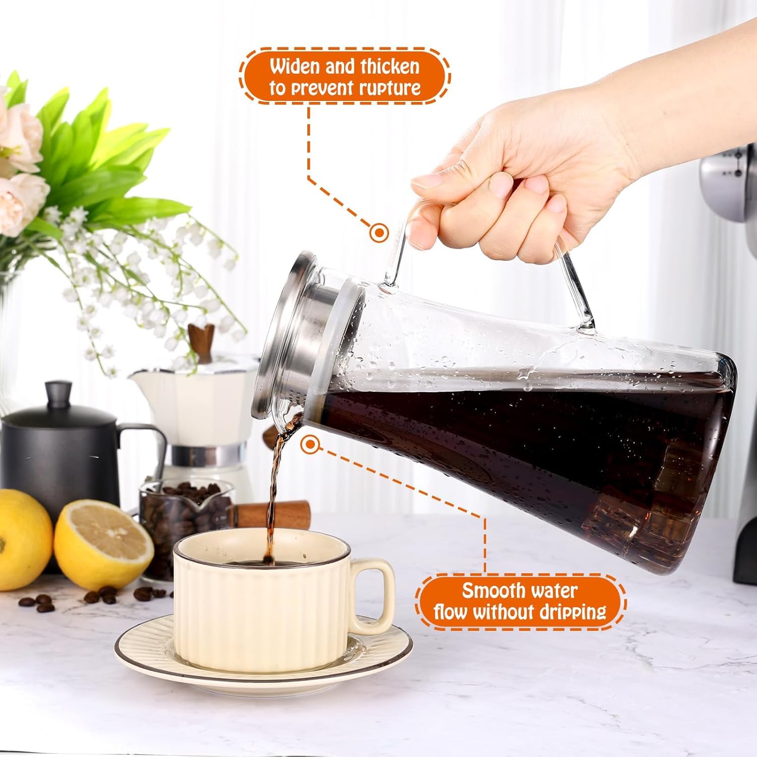 This glass Jug is large capacity and basically meet your whole family’s daily demand, which differentiates from the others. Break and chip resistant, Dishwasher safe / Ergonomic handle for comfortable handling