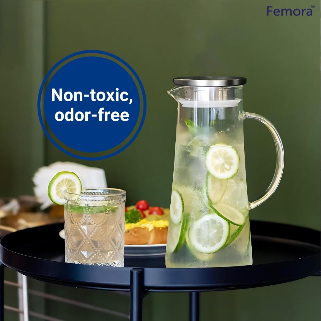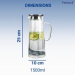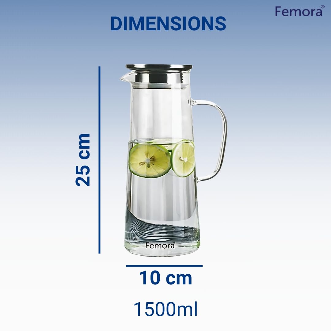Femora Borosilicate Glass Jug with Stainless Steel Lid | 1.7 LTR | Glass Jug with Lid, Glass Water Jug, Pitcher for Serve Juice, Beverage, Cocktail (1 Pcs Set | BPA Free), 1500 milliliters
