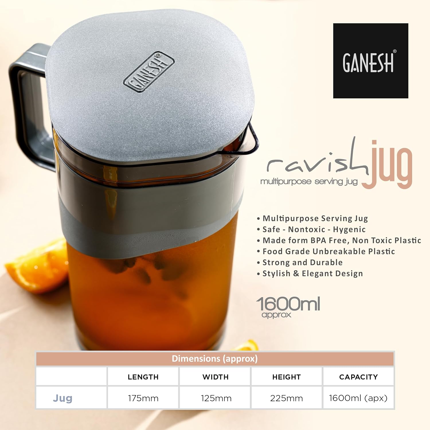 GANESH Plastic Ravish Jug with Lid to Serve Ice Tea, Juice, Cocktail, Mocktail, Beverages, for Dining Table-Color May Vary,1600 ml
