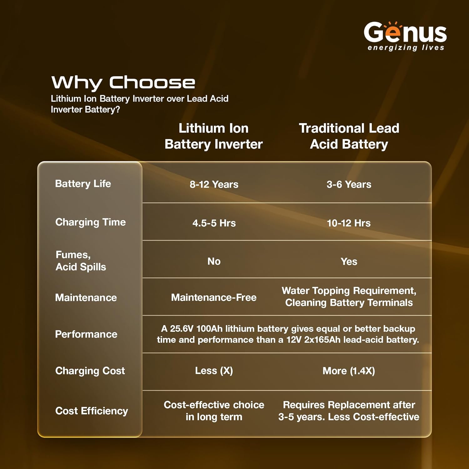 Maintenance Free : Unlike traditional lead acid batteries which require regular water topping, repairs or replacements, Genus Maxilion 2400 Lithium Ion Inverter get rid of maintenance.