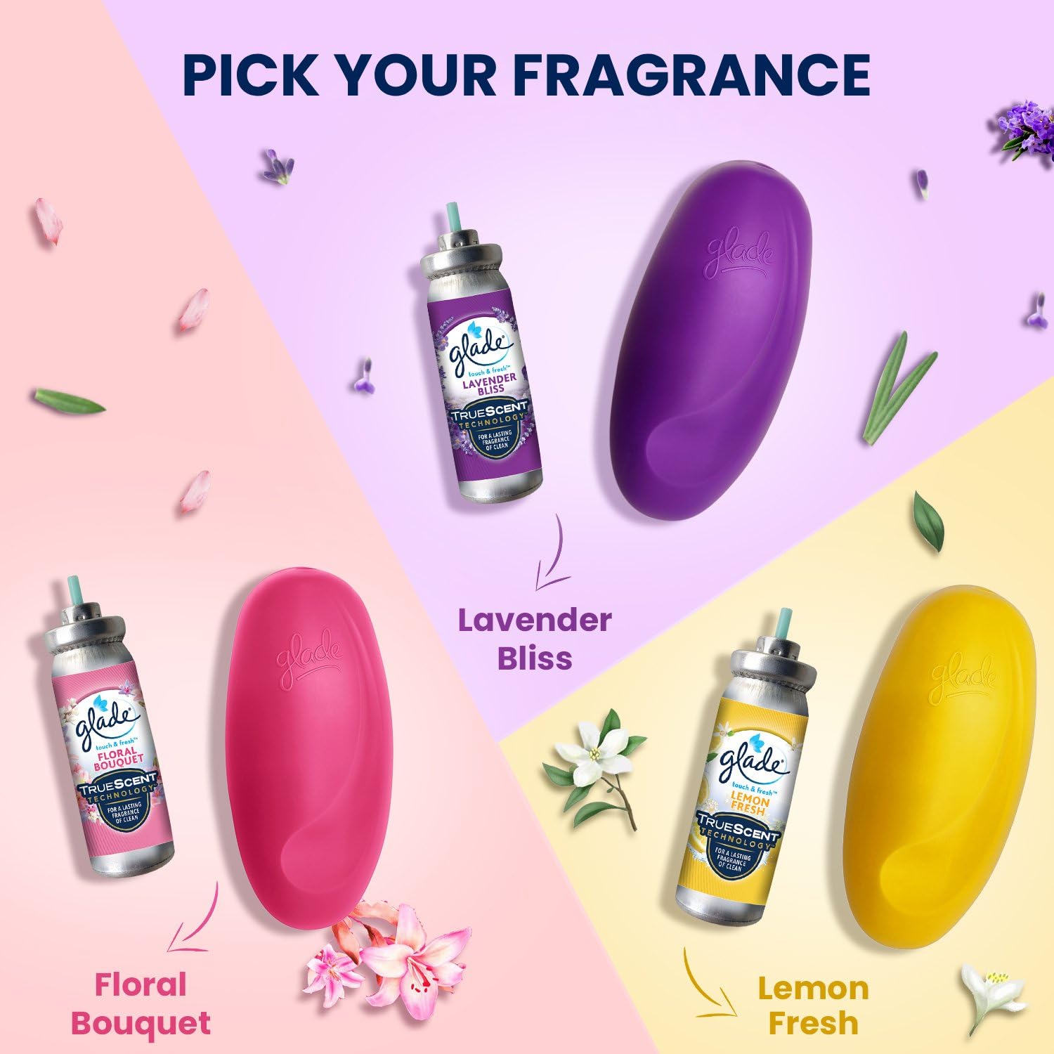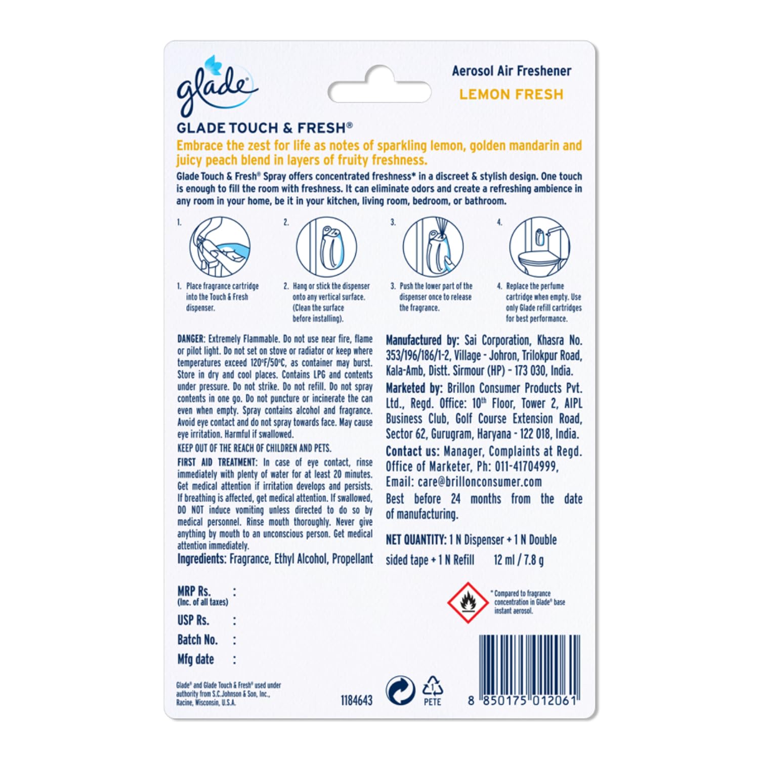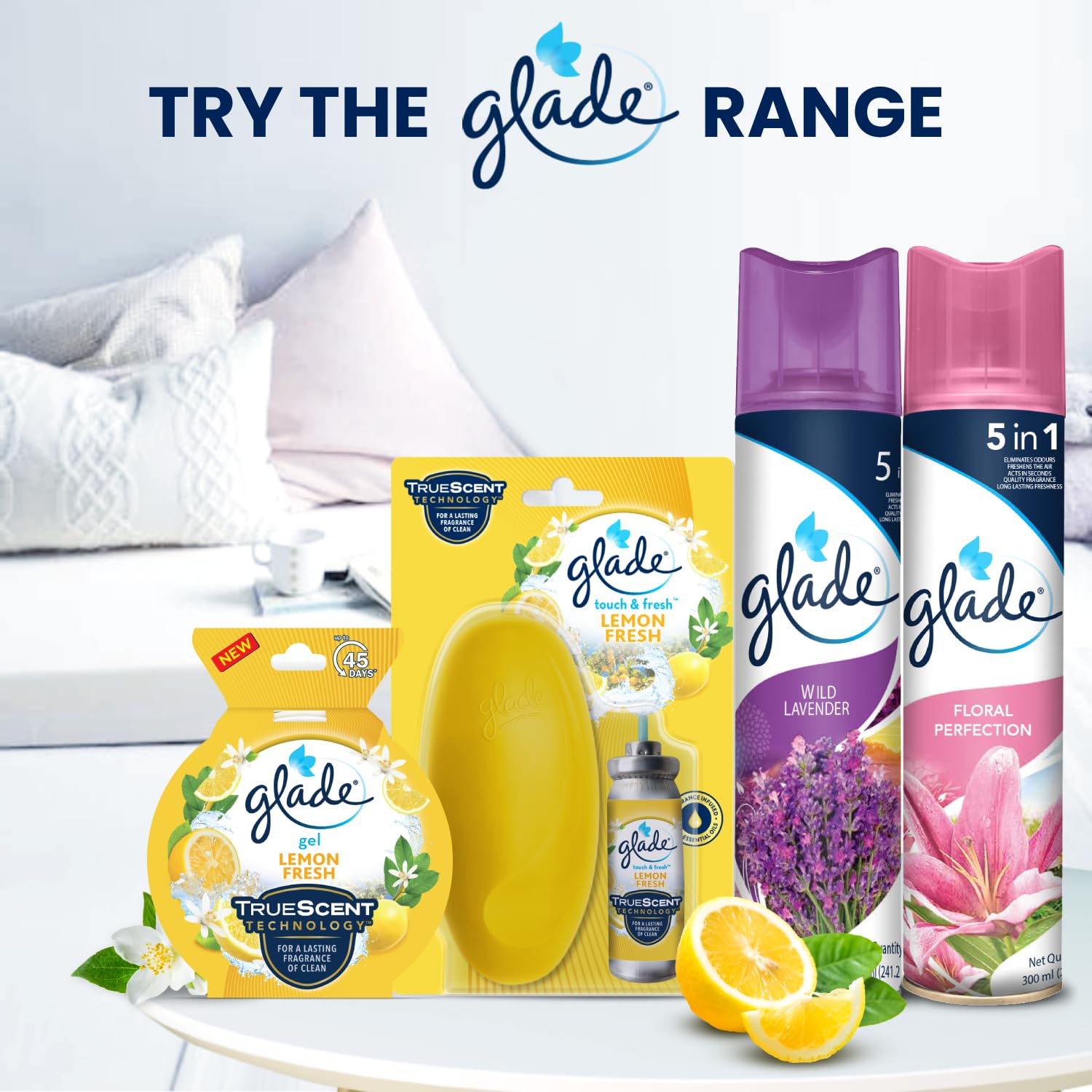 Glade Touch & Fresh is a Compact air freshener spray format that offers Instant Freshness in Just One Touch. Its unique and stylish design adds to the décor of your home. One touch is enough to fill the room with floral freshness. It not just masks but eliminates odours and creates a refreshing ambience in any room of your home, be it your bathroom, kitchen, bedroom or living room. Each room freshener refill lasts up to 100 sprays, giving your home a constant burst of freshness. Infused with Essential oils, Glade Touch & Fresh spray gives a lasting feeling of clean.