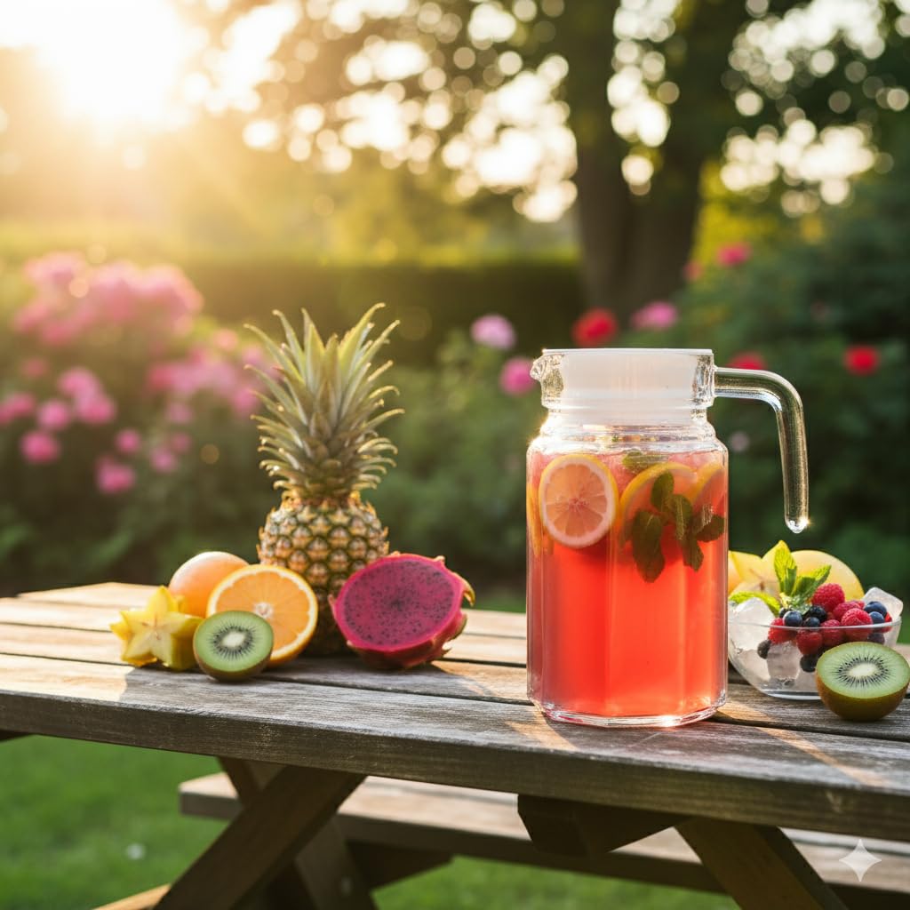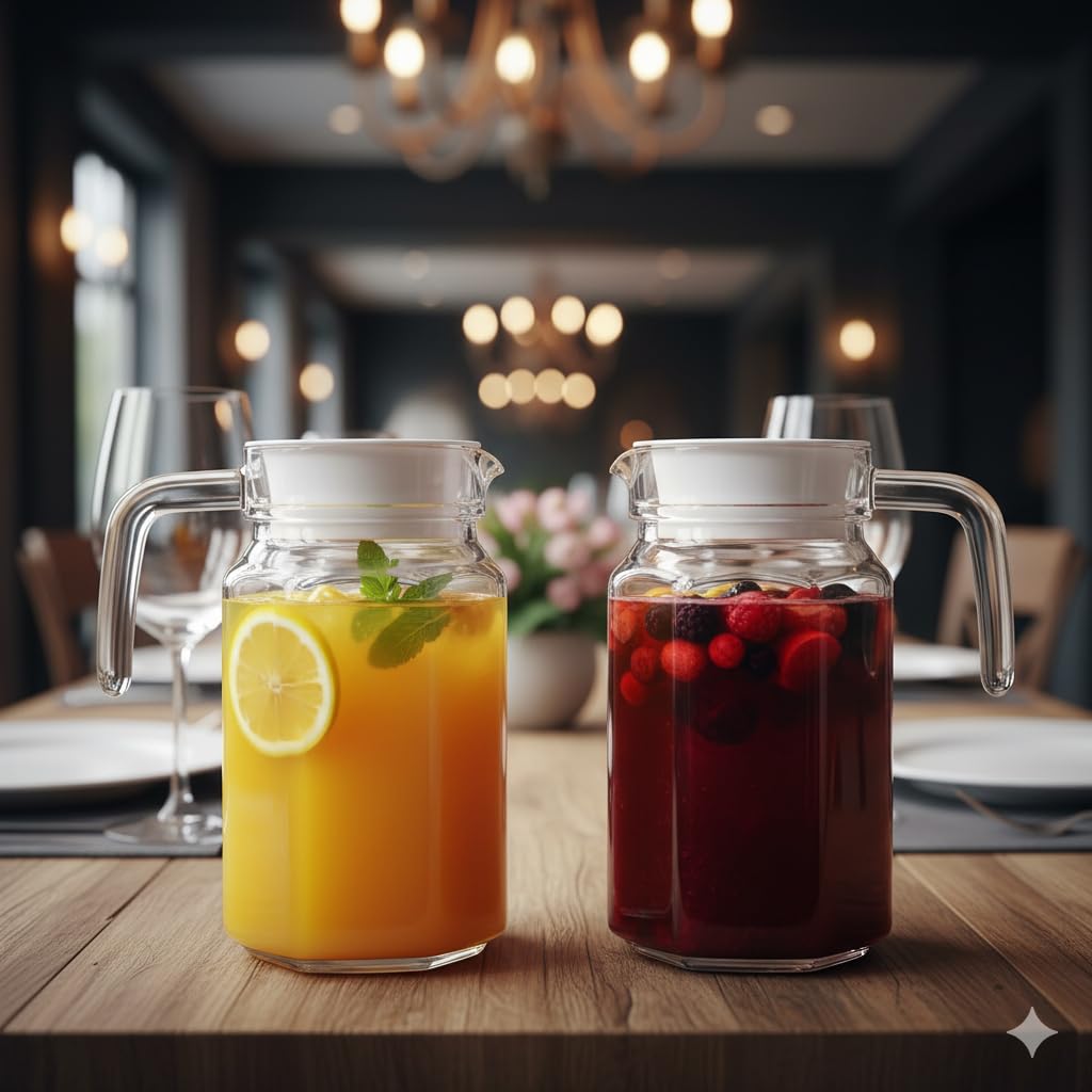 Quench your thirst and elevate your serving style with this beautiful Premium Glass Pitcher. As perfectly captured in the image with fresh lemons, mint, and ice, this pitcher is the ultimate vessel for preparing and serving all your favorite cool beverages. From zesty homemade lemonade and crisp iced tea to sparkling fruit-infused water and morning juice, it’s designed for everyday use and special occasions alike. Crafted from high-quality, heat-resistant borosilicate glass, it’s durable enough for both hot and cold drinks, making it incredibly versatile. The elegant square-ribbed texture not only adds a touch of sophistication but also provides a comfortable grip. The sturdy handle and secure lid ensure effortless pouring and maintain the freshness of your drinks. Its practical design allows it to fit comfortably in most refrigerator doors, saving valuable shelf space. Refreshingly simple, brilliantly clear, and built to last—this pitcher is an indispensable addition to any kitchen.