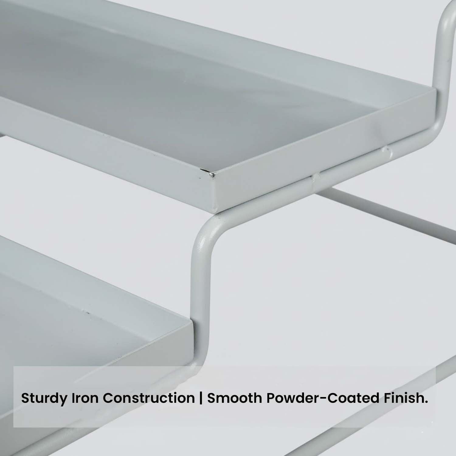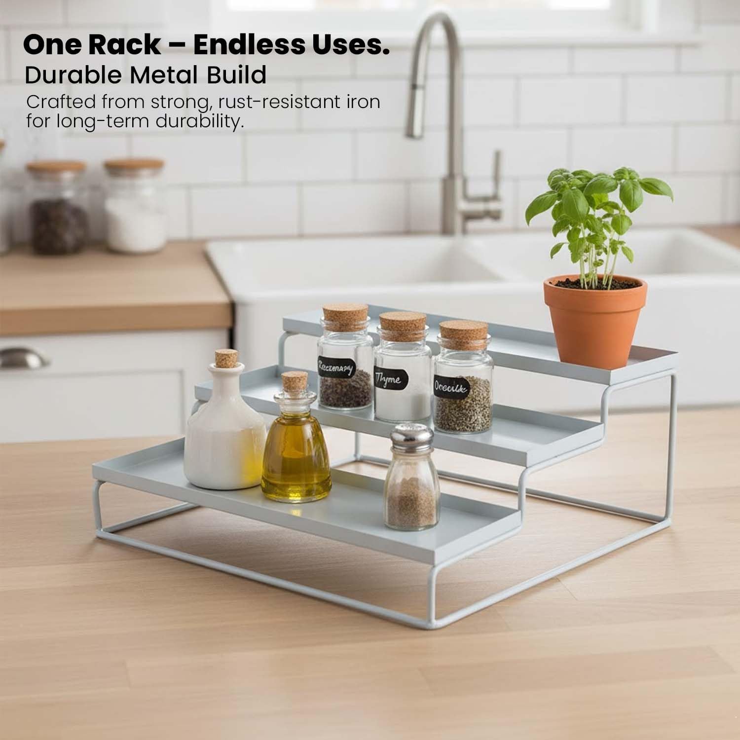 This three-step spice rack is constructed of a tough, high-quality Powder coated Iron sheet. Spices, spice jars, shakers, nibbles, grinders, dry goods, condiments, vitamin and medicine bottles, jars, and more can be arranged and displayed.