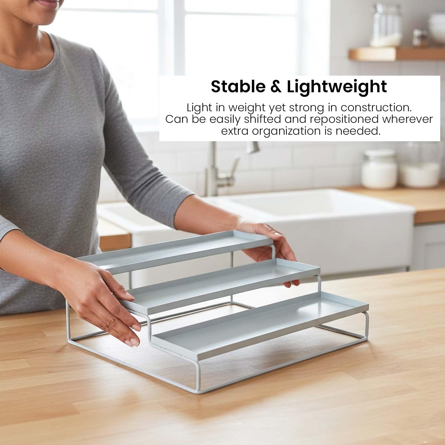 Go Hooked Kitchen 3-Tier Step Standing rack Kitchen Spice Bottle Rack Utensil Holder Food Storage Organizer for Cabinet Cupboard Pantry Shelf Bathroom organizer Rack (White, Pack of 1)