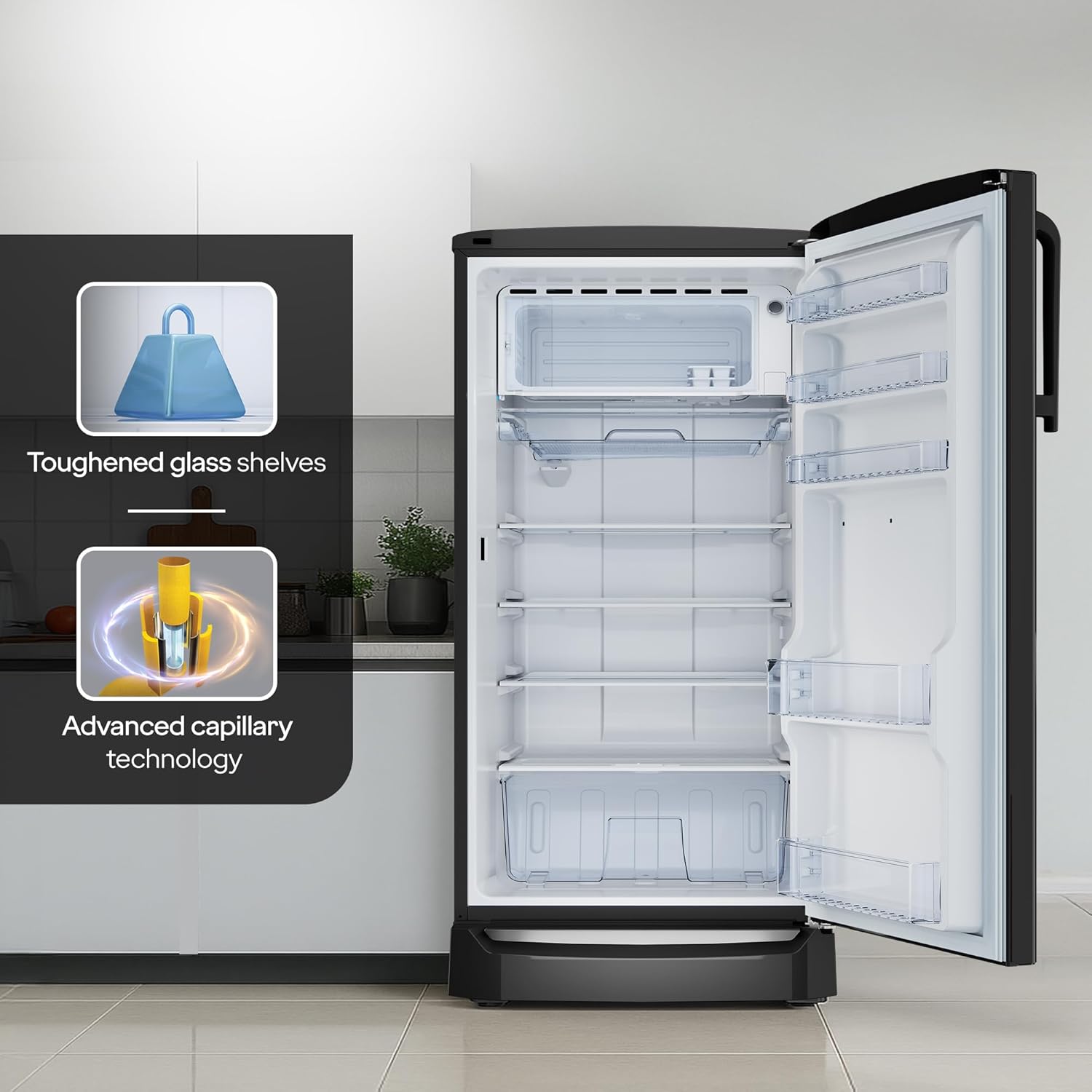 Godrej 207 L 5 Star | Turbo Cooling Technology | Base Drawer | Toughened Glass Shelves | Inverter | Direct Cool | Single Door Refrigerator (2025 Model | RD EMARVEL 230E TDI FS ST | Fossil Steel)