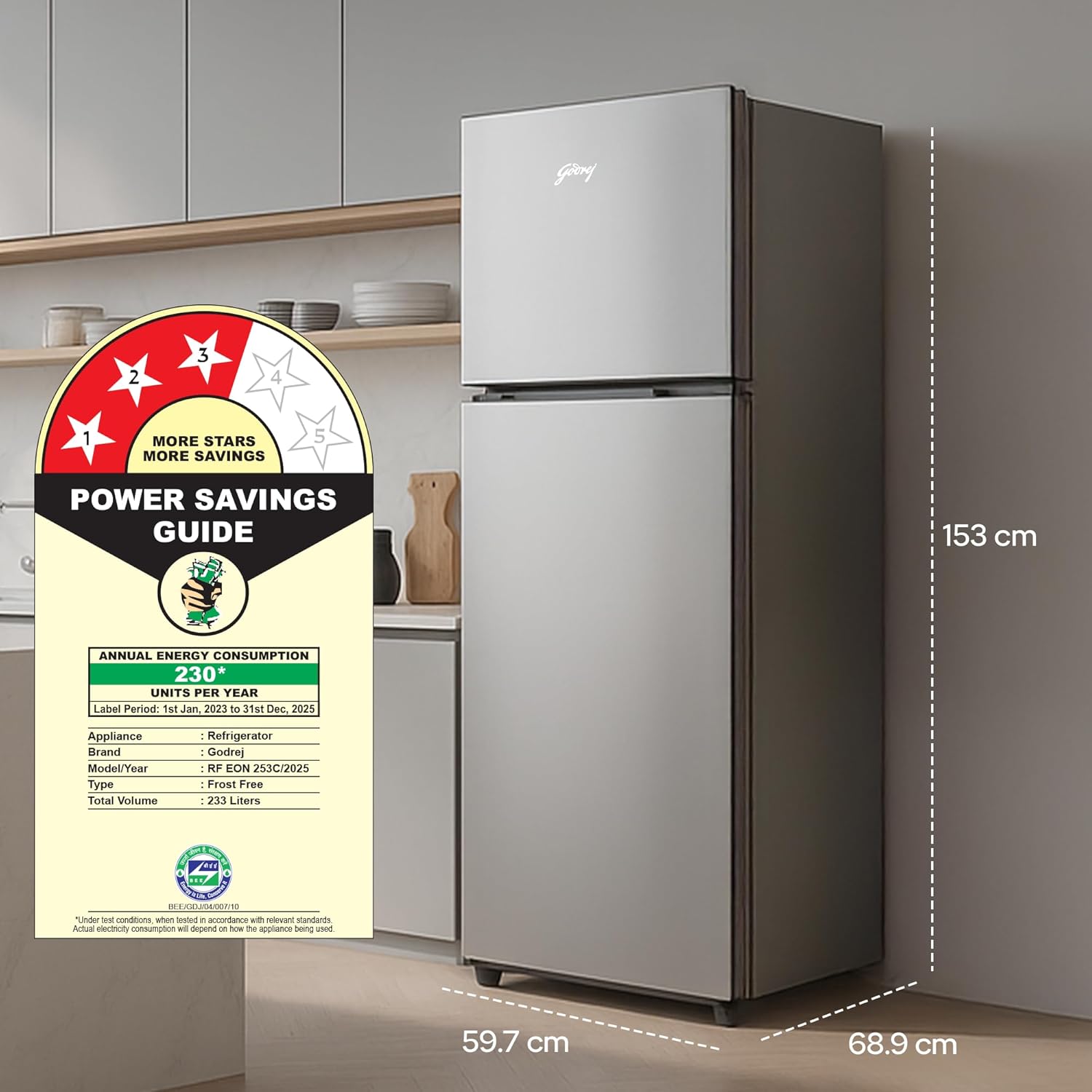 Godrej 238 L 3 Star With 95%+ Food Surface Disinfection with Nano Shield Technology Inverter Frost Free Double Door Refrigerator Appliance (RF EON 253C RI ST GL, Steel Glow)