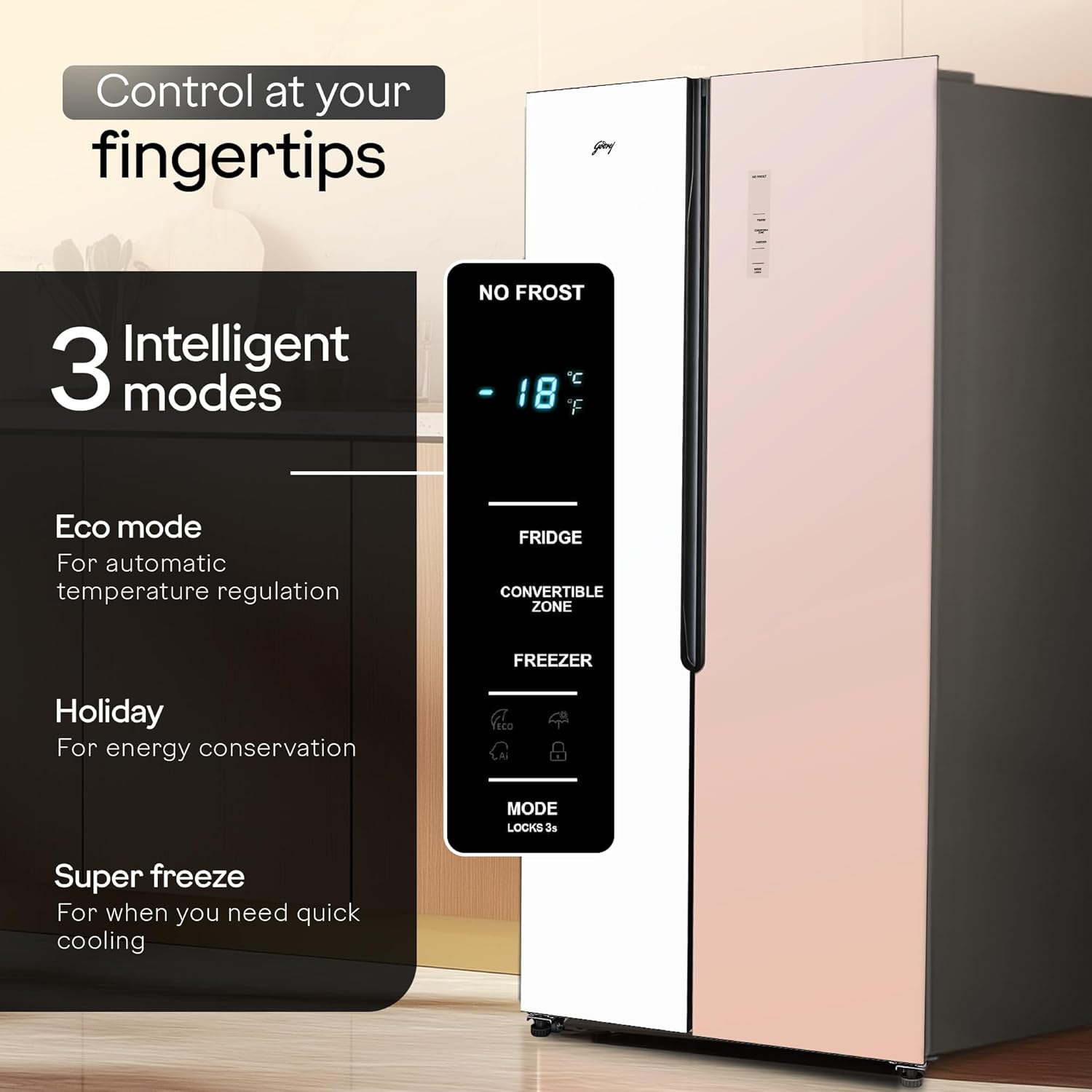 Special Features: Smart convertible zones: The refrigerator has dedicated convertible zones with a temperature range of -3°C to 5°C. -3°C to -1°C for chilling food for short storage, 0°C to 2°C for drinks and dairy products, 3°C to 5°C for fresh fruits and vegetables