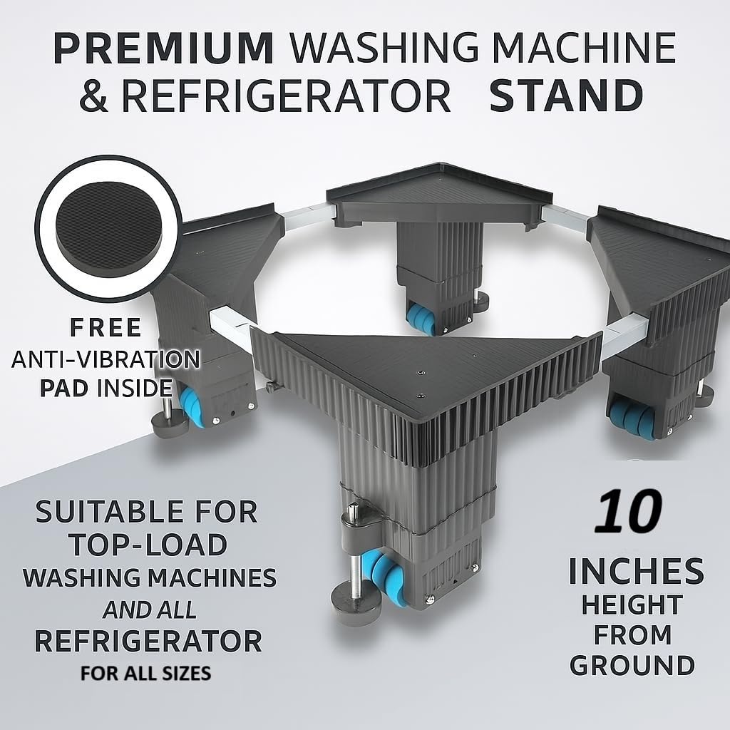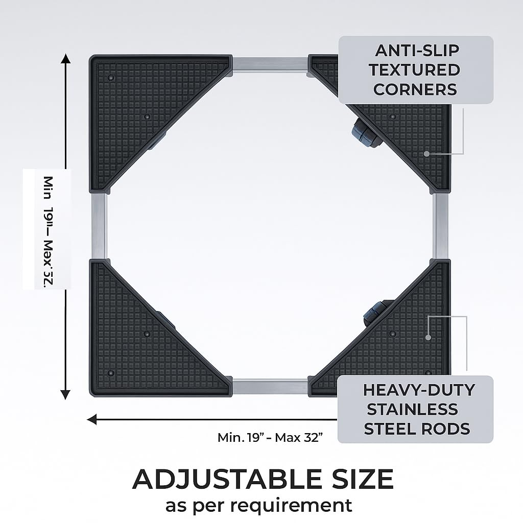 ✅ For Stability and Vibration Absorption: Four Jacks (attached to Hard Rubber at the Bottom) attached to All Four Corners, Jacks can be tightened or loosened easily by rotating clockwise or anticlockwise, These Jacks are very useful in Absorbing Vibrations produced by Washing Machines Special Features: Heavy Duty, Adjustable, Movable, Rust-Proof, Anti-Vibration, Anti-Skidding, Smooth Movement