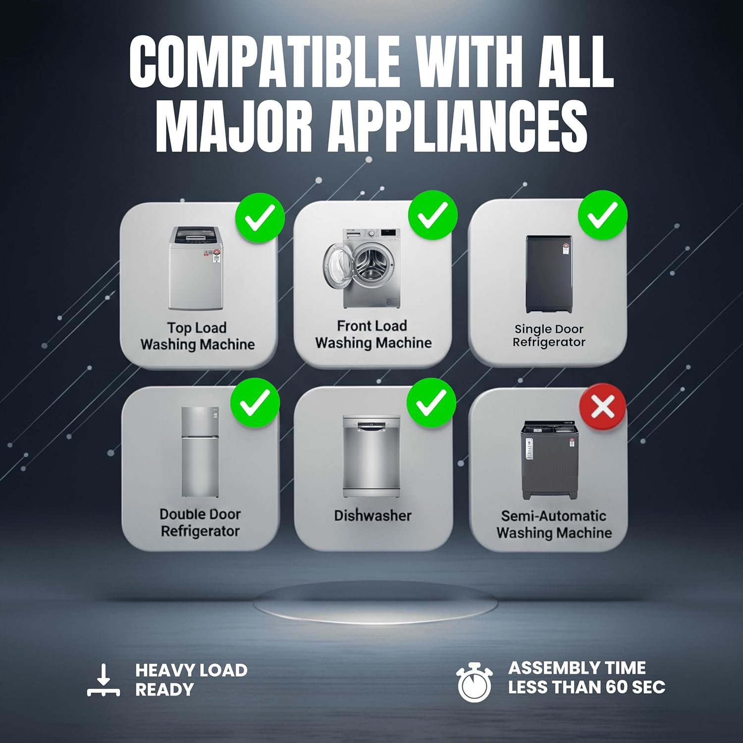 High Load Capacity – Strong and durable frame supports up to 250 KG weight, making it perfect for heavy appliances including 5kg to 16kg top & front load washing machines and large refrigerators.