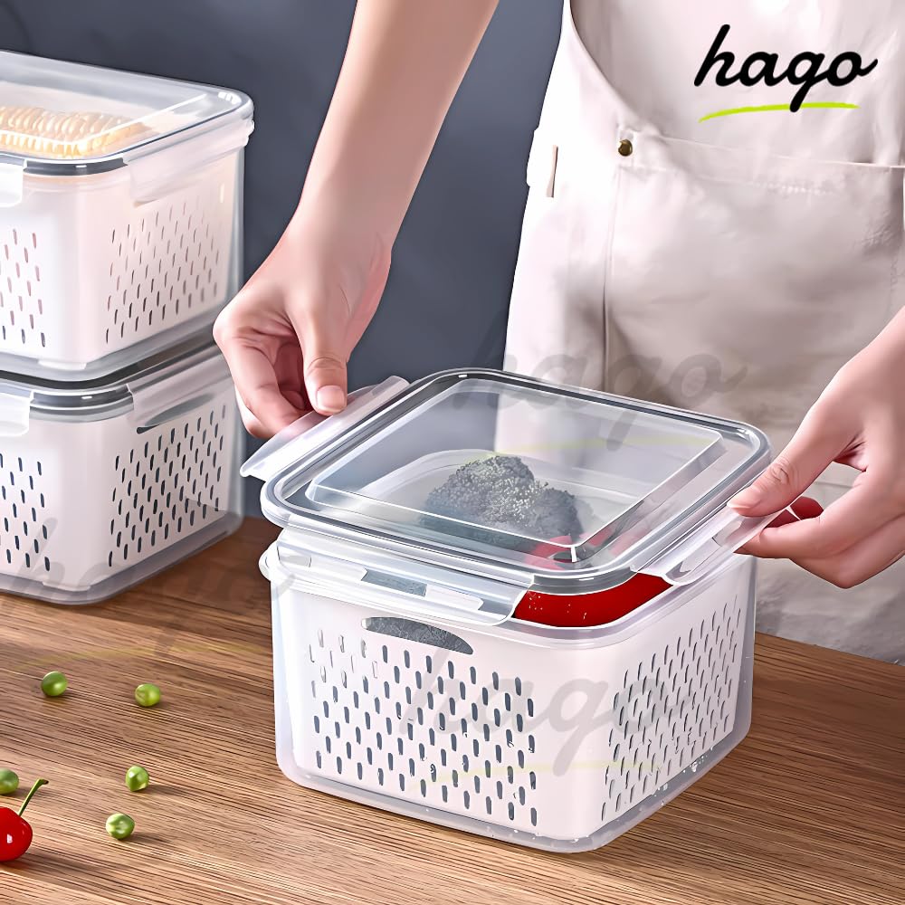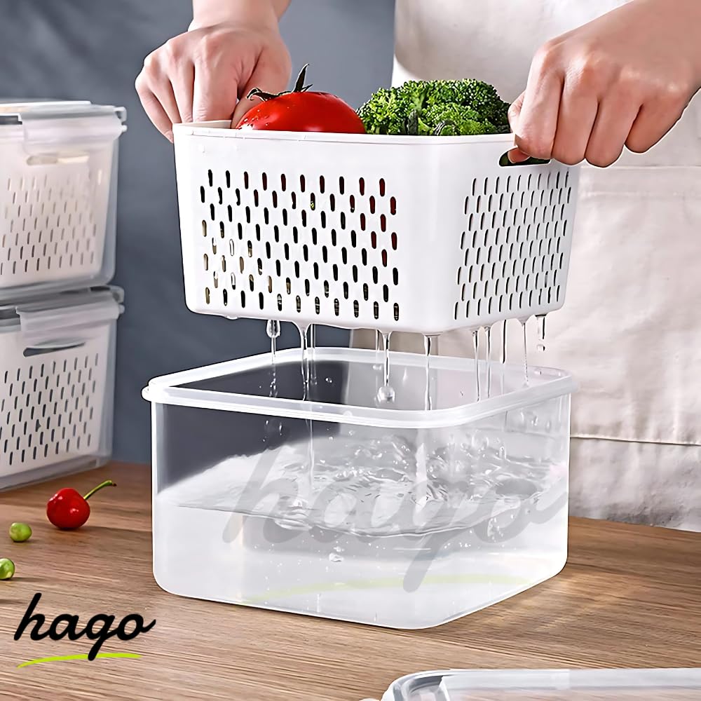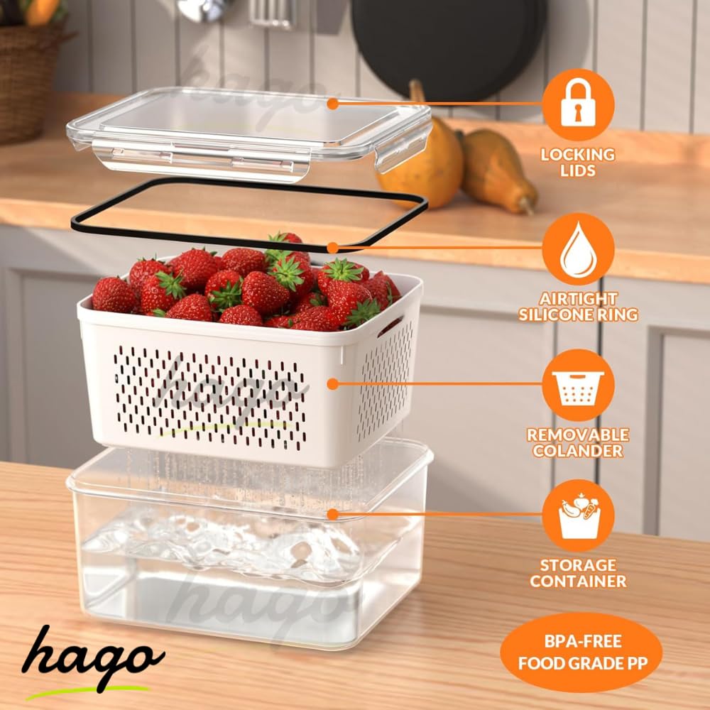 hago Fridge Storage Containers with Drain Basket (4-Piece Set) | BPA-Free Refrigerator Organizer Boxes for Vegetables & Fruits | Stackable Kitchen Storage Containers (600ml, 1400ml, 2600ml, 4500ml)