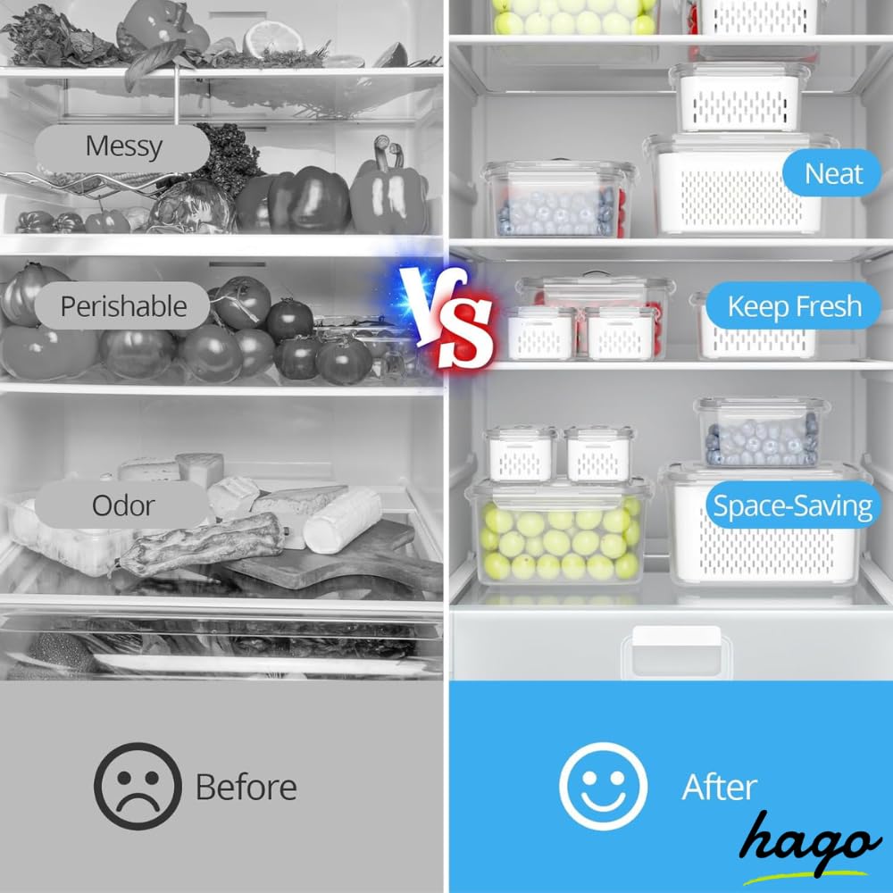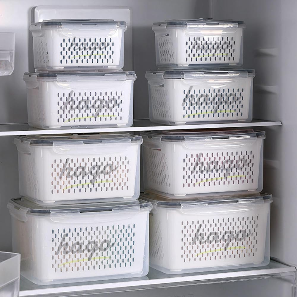 8 reviews for hago Fridge Storage Containers with Drain Basket (4-Piece Set) | BPA-Free Refrigerator Organizer Boxes for Vegetables & Fruits | Stackable Kitchen Storage Containers (600ml, 1400ml, 2600ml, 4500ml)