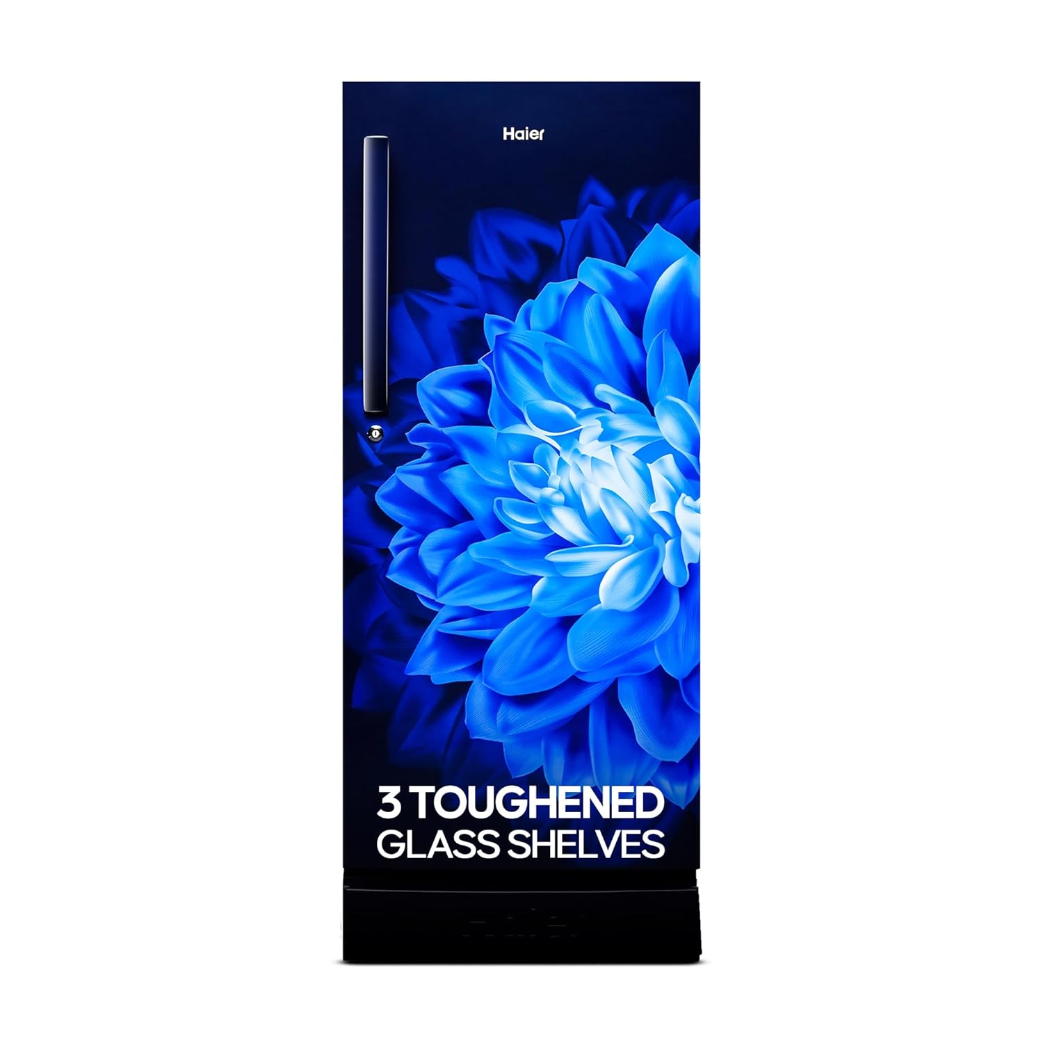 Haier 190L 5 Star Direct Cool Single Door Refrigerator | 3 Toughened Glass Shelves | Fast Ice Making in Just 60 minutes | Large Veg Box| Easy Clean Back (HED-205MDB-P, Marine Dahelia, Base Stand)